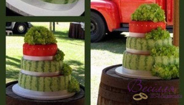 Щоб ваше літнє весілля було неперевершеним, організуйте його в єдиному стилі, надавши свіжості й яскравості кавуна. Можна вибрати відповідну кольорову гамму одягу наречених, або ж використати відповідні кольори в букеті. Приміром, наречена в білій сукні з зеленувато-рожевим букетом, наречений в традиційному костюмі з невеликим зеленим хусточкою будуть гармонійно виглядати на тлі зелено-рожевих декорацій.