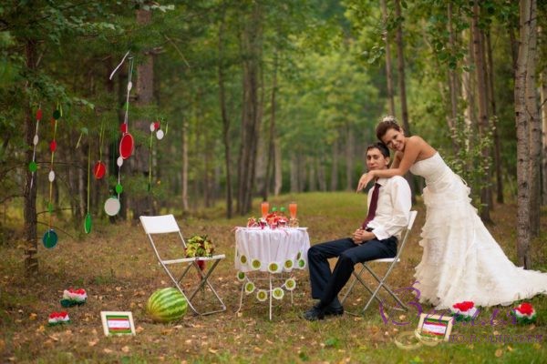 Оригінальною буде й весільна фотосесія з кавунами. Найкраще її провести на природі. Соковита зелено-жовта кірка ягоди відмінно поєднується із зеленим фоном лісу або безкрайніх лугів. Наявність озера або будь-якого іншого водоймища додасть родзинки і колориту. Більш того, з водною гладдю можна пограти, пускаючи по ній кавунові кораблики.