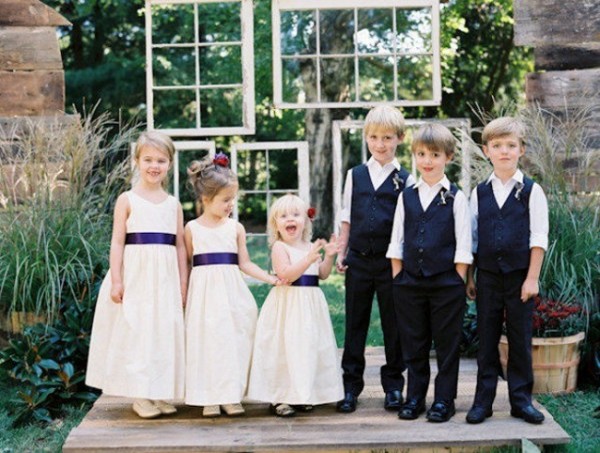 Якщо ви вирішили, що дітки будуть брати участь у церемонії, тоді продумайте для них і одяг: краще, якщо вони будуть одягнені однаково – дівчатка в однакових сукнях, а хлопчики – у смокінгах.