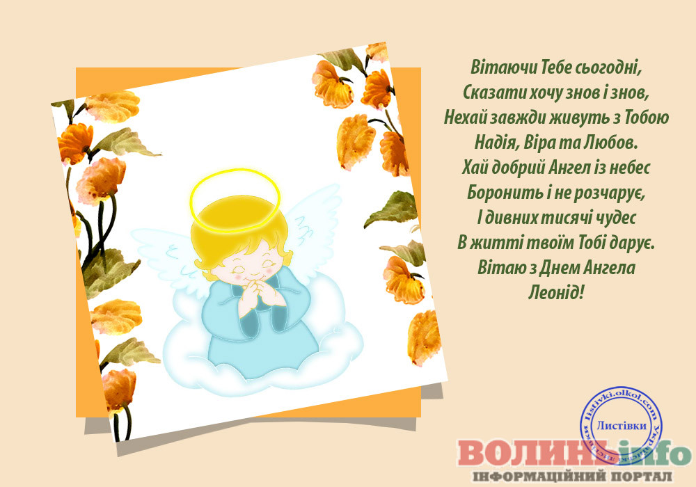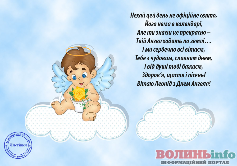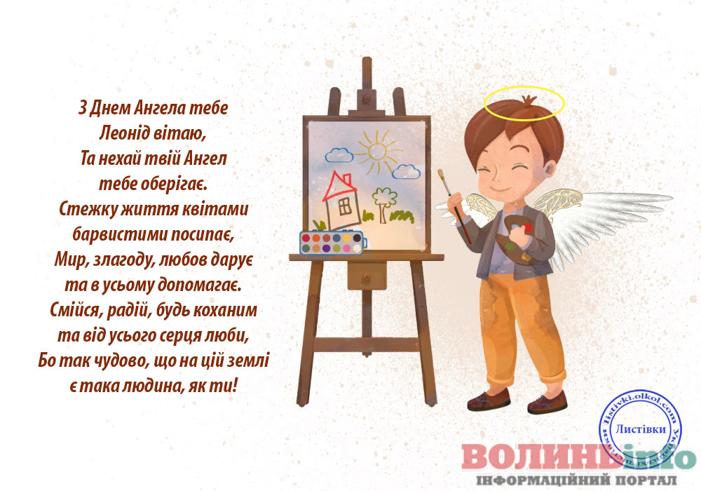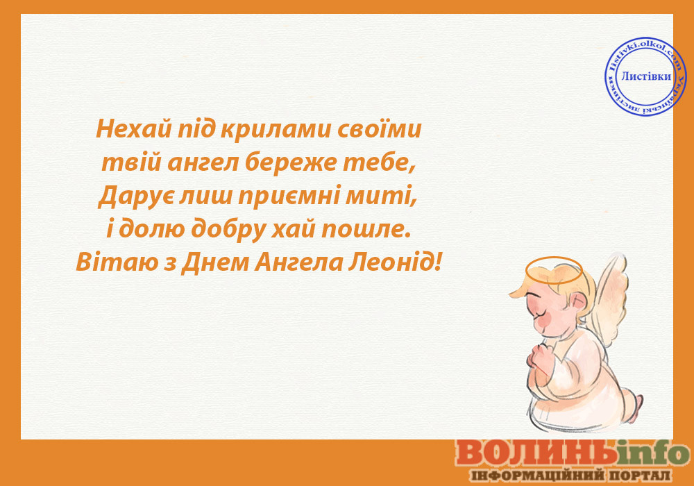 Леоніде, у День ангела хочу побажати, щоби твій Ангел завжди тебе оберігав і допомагав тобі у всіх твоїх справах – домашніх і робочих, щоб всі твої починання були втілені в життя, щоб тобі завжди супроводжували удача, процвітання і успіх.