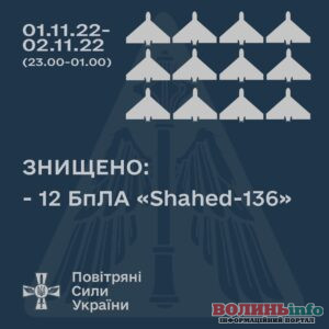 Вночі протиповітряною обороною було збито 12 з 13 дронів-камікадзе «Shahed-136», – Повітряні сили ЗСУ.