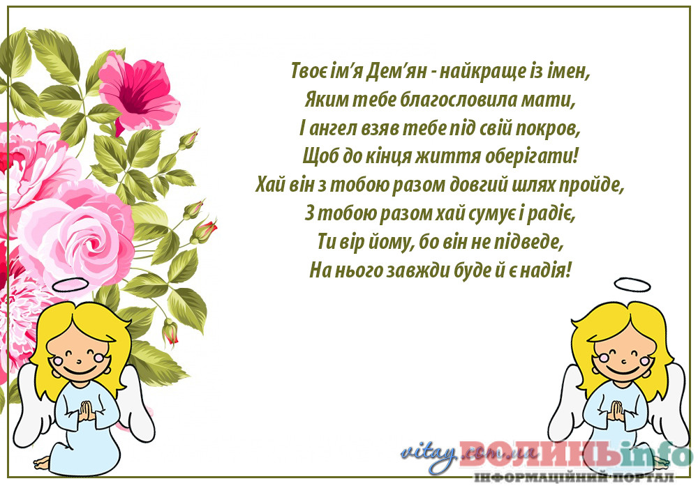 Дорогий Дем’ян. Вітаю з Днем Ангела! У це свято бажаю тобі завжди знаходити сили, щоб протягнути руку допомоги нужденним і частіше зустрічати на життєвому шляху таких же добрих і чуйних людей, як ти. Нехай в твоїй душі панує гармонія та любов!