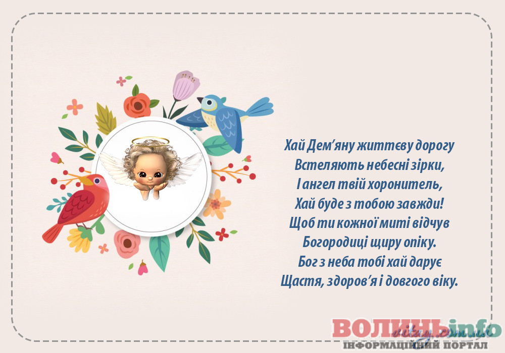 Дорогий Дем’ян! Нехай твій ангела почує всі твої молитви і допоможе впоратися з усіма негараздами на життєвому шляху! Будь стійким у своїй вірі, допомагай нужденним, прощай людям їх помилки і будь милосердним по відношенню до близьких. Зі святом тебе!