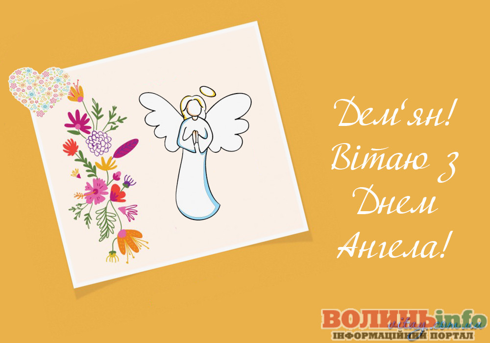 Вітаю з Днем Ангела Дем’яна. Нехай ангел тебе не покидає, нехай удача від тебе не відходить, нехай мужність веде тебе до благородної перемоги. Від щирого серця бажаю здоров’я, любові, благополуччя, миру, радості, міцних сил і першості у всьому. Хай щастить!