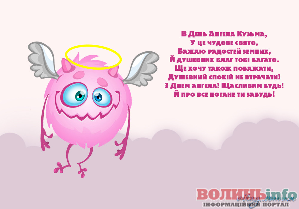 Дорогий Кузьма. Вітаю тебе з Днем Ангела. Хочу побажати тобі щирого і справжнього щастя, доброї і незмінної вдачі, великих і незламних успіхів, нереального і великого везіння, міцного і дуже міцного здоров’я. Хай твій ангел вберігає тебе все твоє життя.