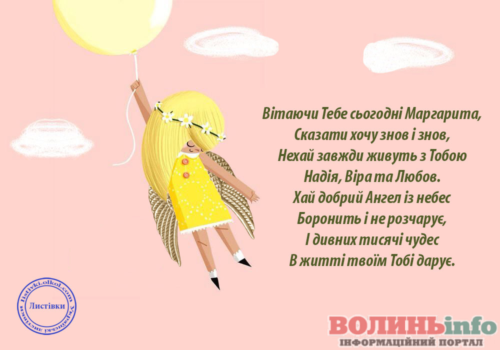 Сьогодні світле для тебе Маргарита свято — День Ангела, день твого небесного захисника і покровителя. Нехай же він оберігає тебе, охороняє у важкі моменти життя та ніколи не відмовляє тобі в надії та любові. З Днем Ангела!