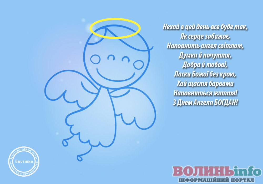 З Днем ангела, Богдан. Нехай твій крилатий захисник захистить тебе від негоди, від непотрібного смутку, від дурних ідей, від поганих людей, від злих днів. Нехай в твоєму житті завжди править щастя і любов і нехай твій шлях буде усіяний зірками удачі та надії.