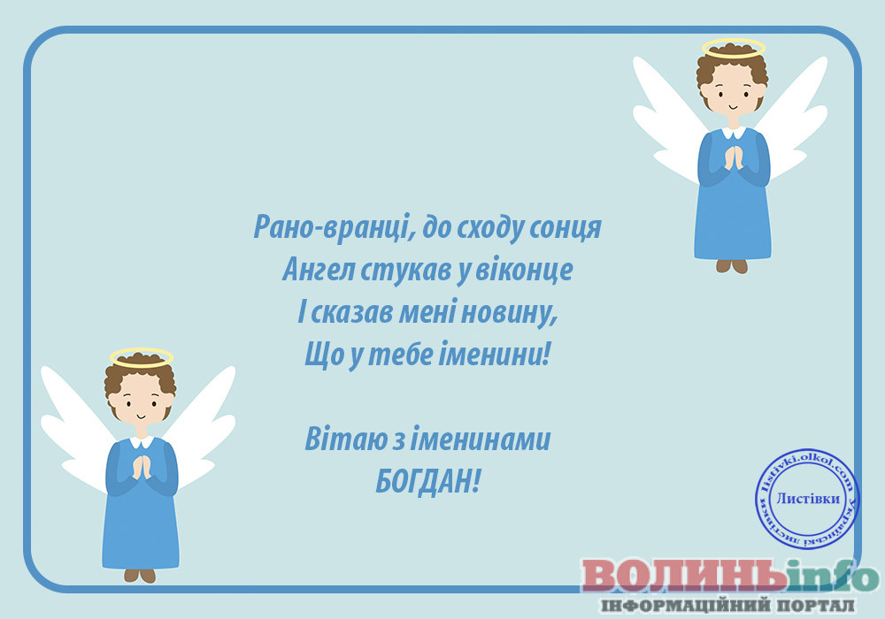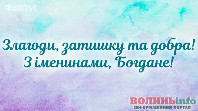 Дорогий Богдан. Вітаю тебе з чудовим святом – Днем Ангела Богдана! Від щирого серця хочу побажати тобі яскравого життя, непереможних сил і міцної віри. Твори добро і допомагай нужденним, не відступай від своїх цілей і прагнень, осягай любов рідних і опромінюй цей світ добротою своєї душі.
