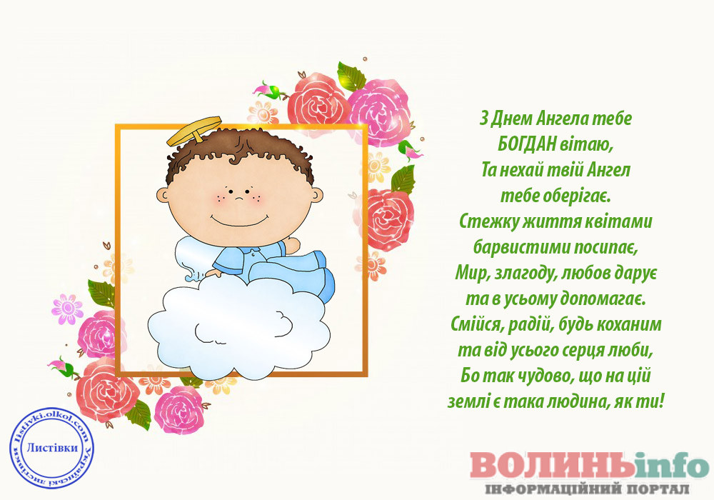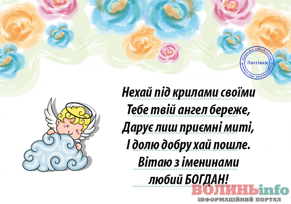 Дорогий Богдан. Вітаю тебе з Днем ангела і бажаю тобі завжди з посмішкою зустрічати новий день. Нехай всі бажання виконуються, а віра в краще супроводжує тебе по життю. Нехай твій ангел-охоронець завжди буде з тобою поруч і вберігає тебе від всього поганого.