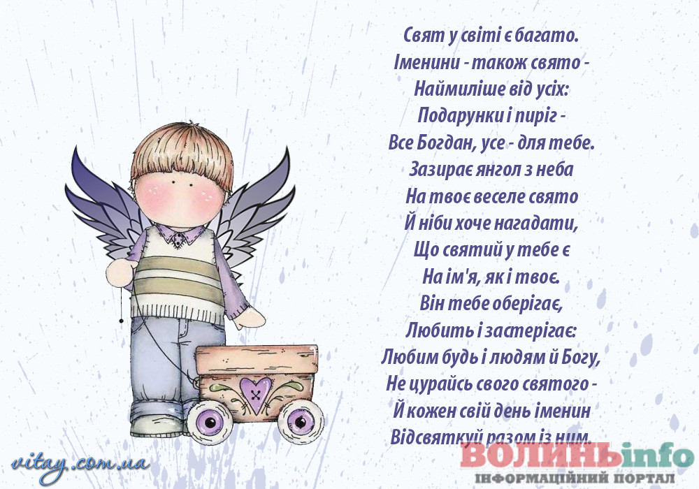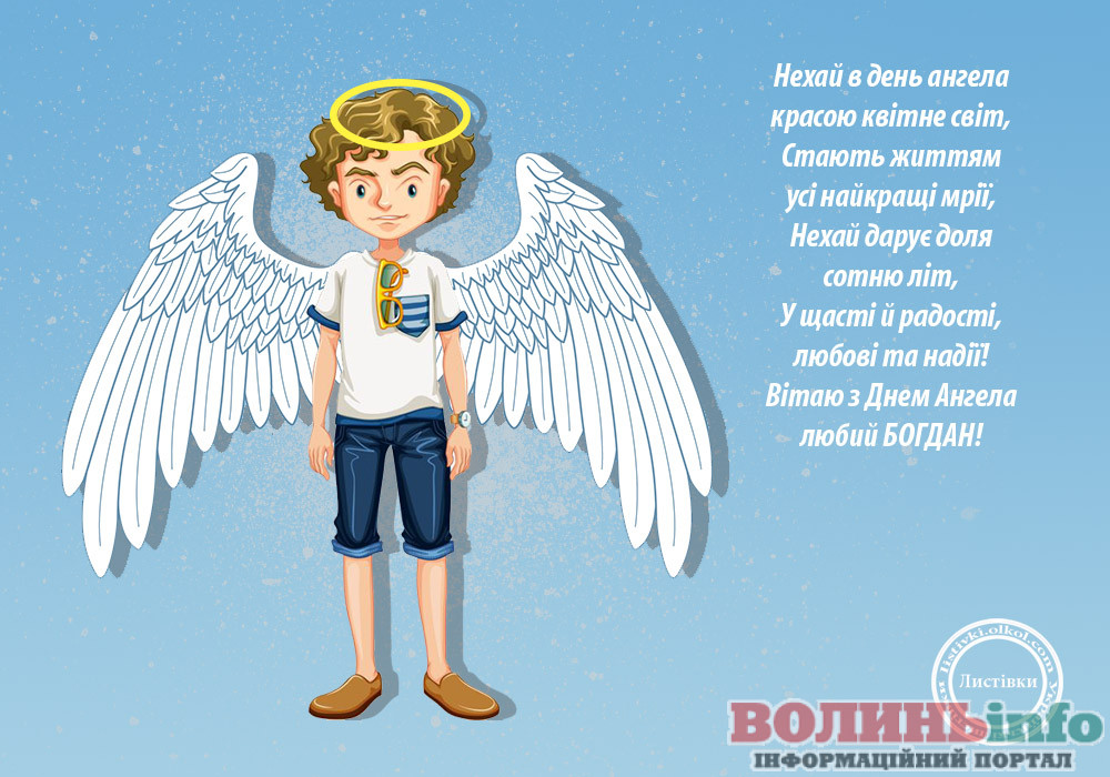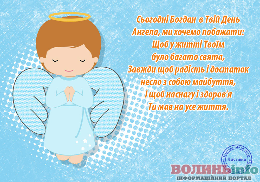 Дорогий Богдан! Нехай твій ангела почує всі твої молитви і допоможе впоратися з усіма негараздами на життєвому шляху! Будь стійким у своїй вірі, допомагай нужденним, прощай людям їх помилки і будь милосердним по відношенню до близьких. Зі святом тебе!