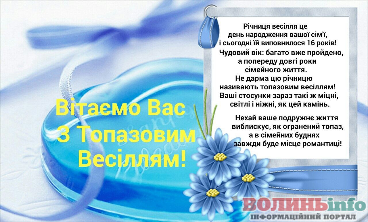 Щиро вітаю з топазовим весіллям, з благополучно прожитим спільним 16-річчям. Бажаю вам, дорогі, міцних і твердих сил, як топаз, вірного блага і щастя в житті, вічного вогню та тепла у відносинах, доброго здоров’я, високого достатку і взаємоповаги.
