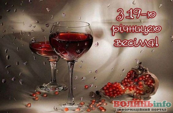 Вітаю від душі з гранатовим вашим щастям, з 19-річною річницею подружнього життя. Від усього серця бажаю вам насичених барв життя і незгасаючих щирих почуттів, добра в сім’ї і затишку в домі, великої удачі на вашому шляху і приємних подарунків від життя.