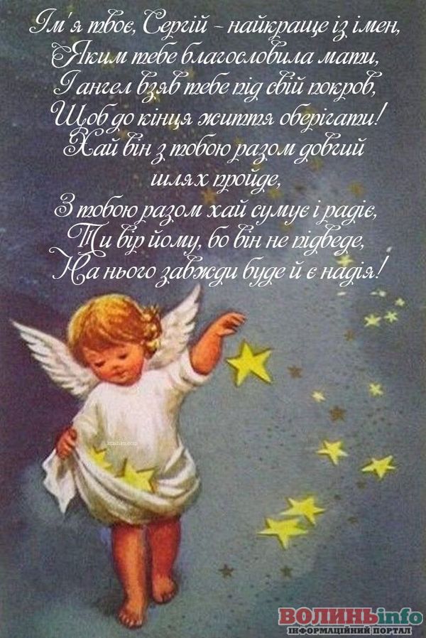 Сергію, вітаю тебе з твоїм Днем ангела і бажаю, щоб навіть найтемніша смуга у твоєму житті виявилася злітної. Нехай попереду тебе чекає тільки щастя і радість. Зі святом! Успіхів, здоров’я і всього найкращого. Кохай та будь коханим, адже це найголовніше для кожної людини.
