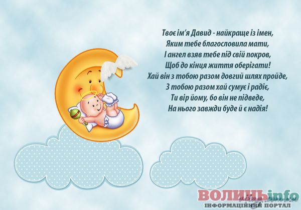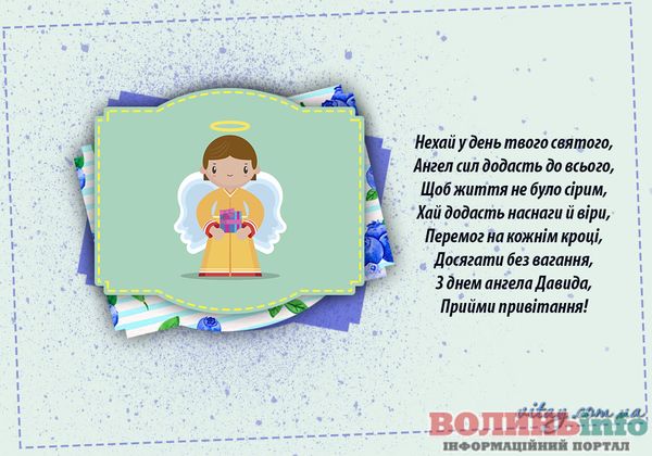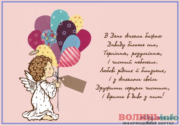 З Днем ангела, Давид! Твій небесний опікун подарував тобі безліч хороших якостей. Бажаю тобі НЕ розгубити цей цінній набір ангельських подарунків по жітті и пішатися тім ім’ям, что подарували тобі твої батьки.