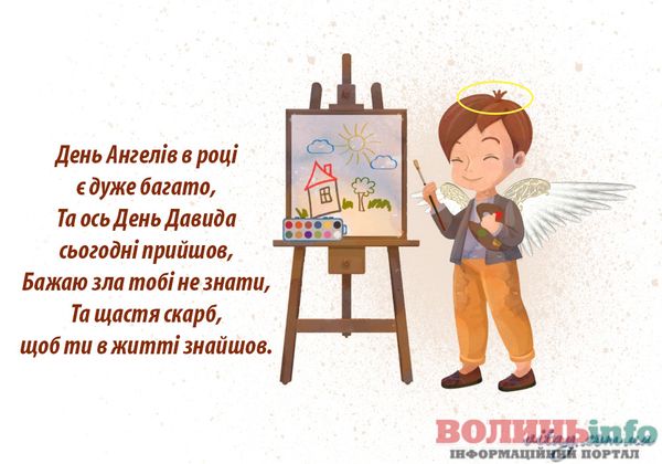 Давид, вітаю з Днем ангела! Нехай кожна мить приносить сотні шансів зробити життя ще яскравішим і щасливішим! Нехай будь-яка хвилина дарує тільки вдачу і море позитиву! І ангел-хранитель береже тебе від усіх негараздів.