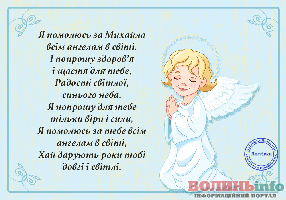 У День ангела хочу побажати, щоб твій ангел завжди тебе оберігав і допомагав тобі у всіх твоїх справах – домашніх і робочих, щоб усі твої починання були втілені в життя, щоб тобі завжди супроводжувалась удача, процвітання і успіх.