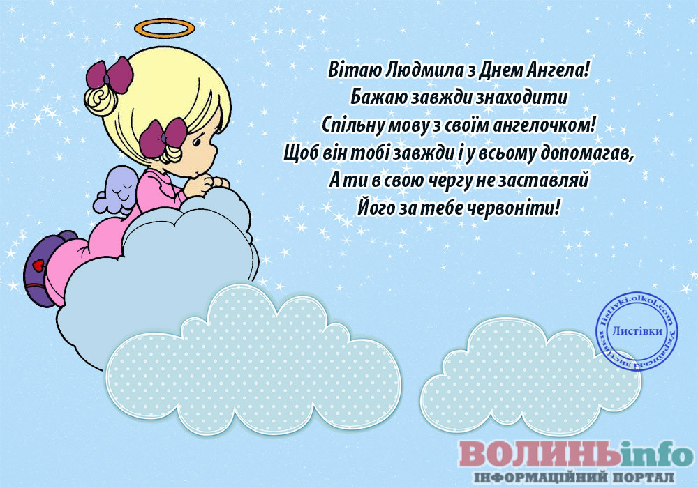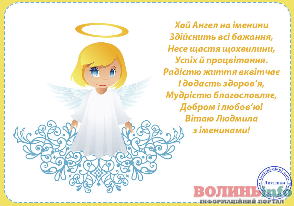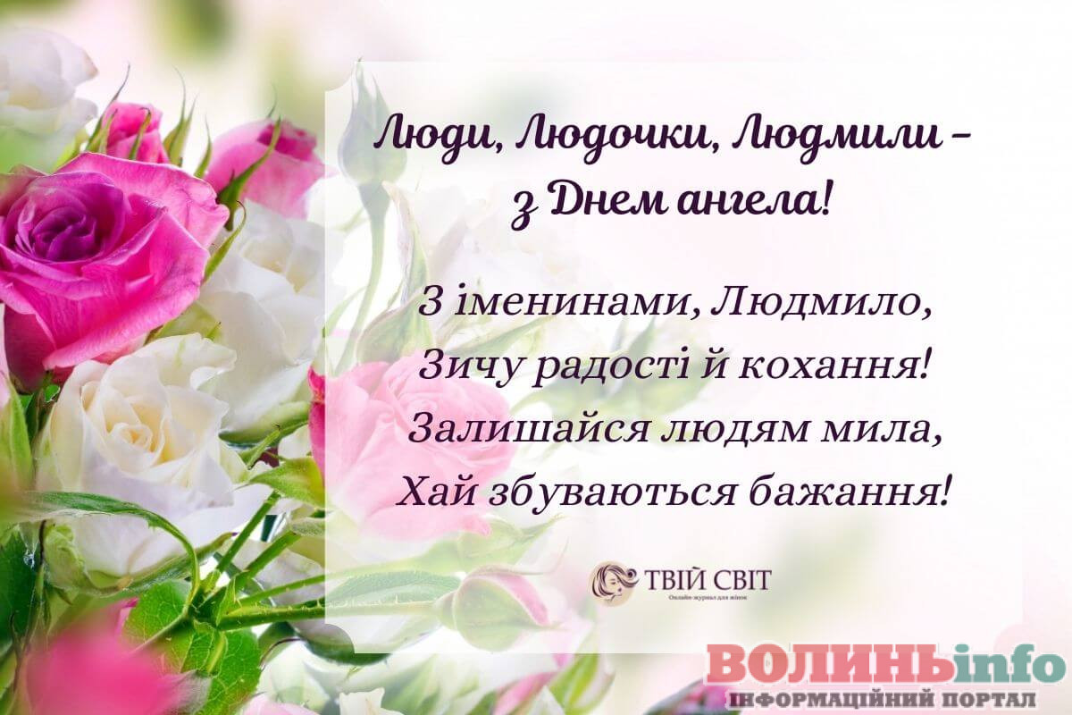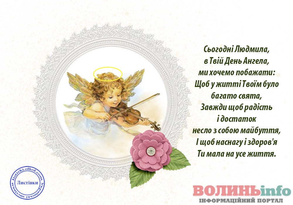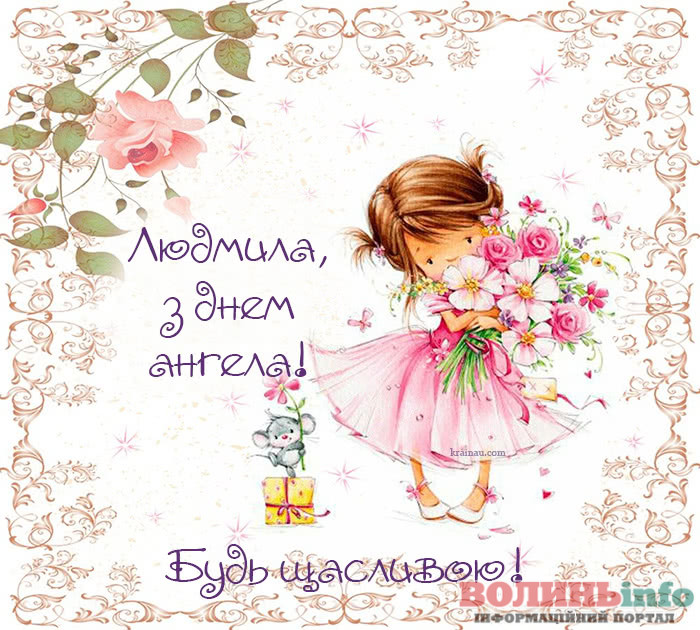 Дорога Людмило, я вітаю тебе з Днем Ангела! Бажаю тобі багато-багато щастя, любові, здоров’я, тепла, посмішок. Хочу, щоб ти залишалася все такою ж позитивною і радісною. Нехай тебе оточують лише дорогі та кохані люди, нехай всі нещастя і знегоди обходять тебе стороною. Всіх благ і море позитивних подій! Нехай посмішка якомога частіше сяє на твоєму гарному личку! Я від щирого серця бажаю тобі здійснення всіх бажань і удачі у всіх починаннях!
