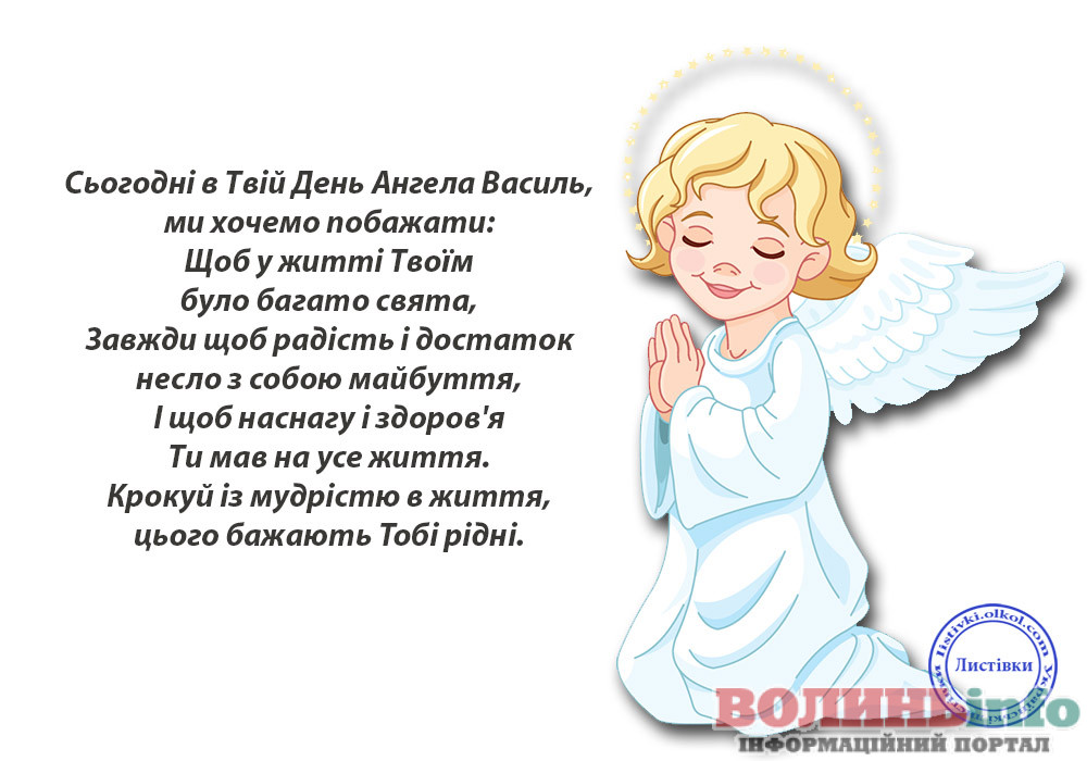 Дорогий Василю, вітаю тебе з Днем ангела! Твій небесний опікун подарував тобі безліч якостей: доброта, повага до інших, щирість і чесність. Бажаю тобі не розгубити цей цінний набір ангельських подарунків і пишатися тим ім’ям, яке подарували тобі батьки.
