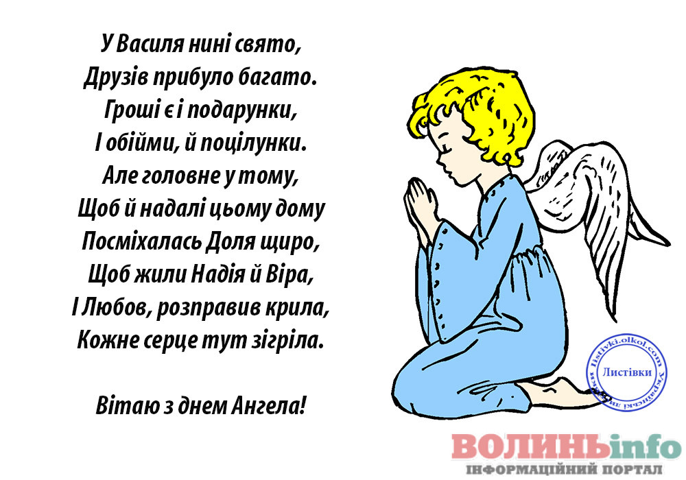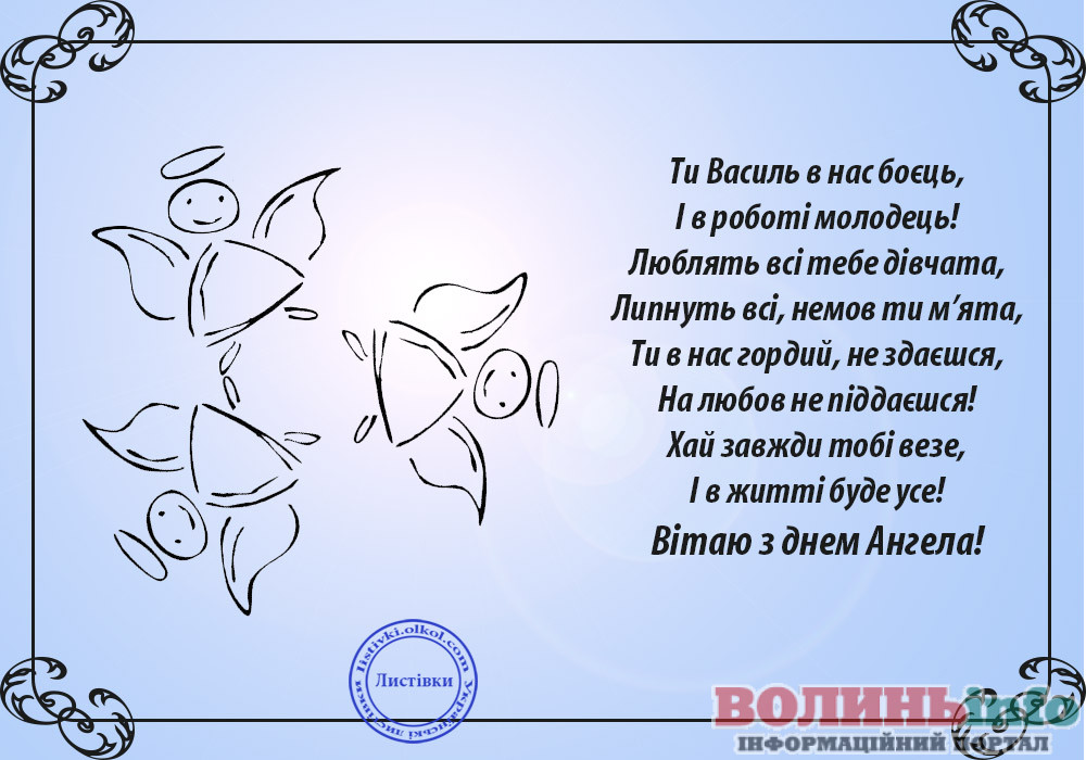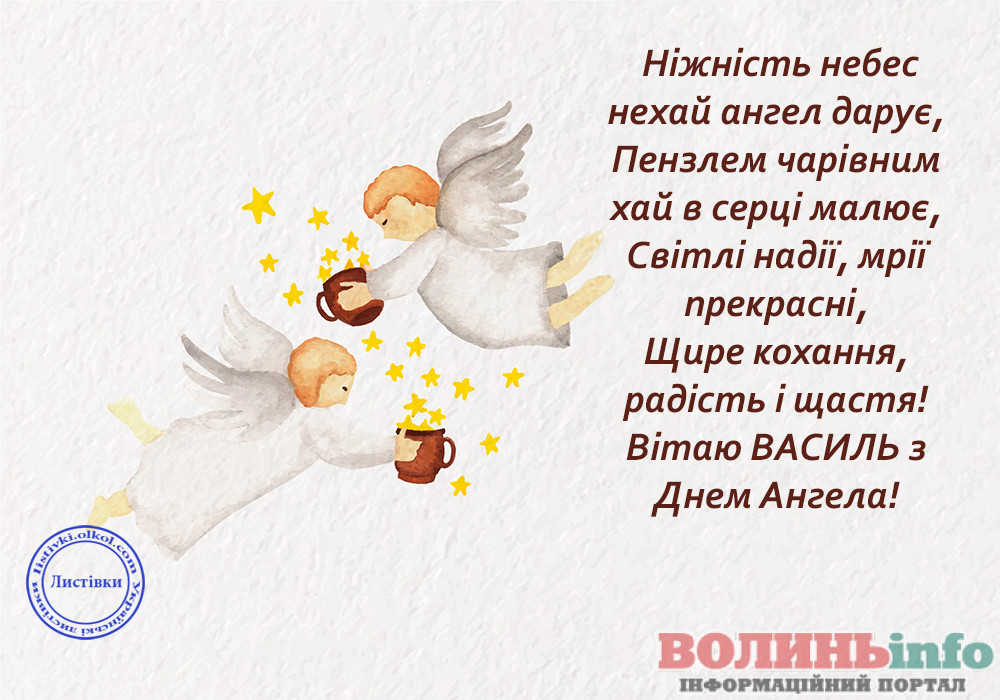 Нехай ангел небесний тебе Василь збереже, поставить захист твердий, як граніт. З Днем ангела вітаємо тебе! Твої найкращі в світі друзі.