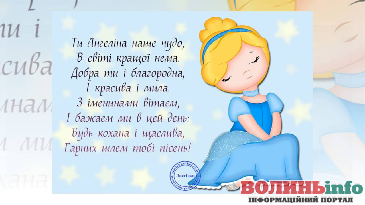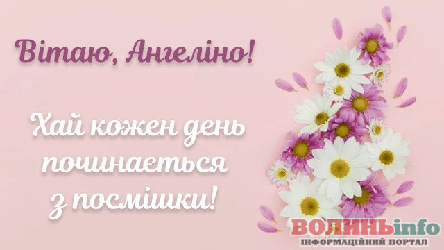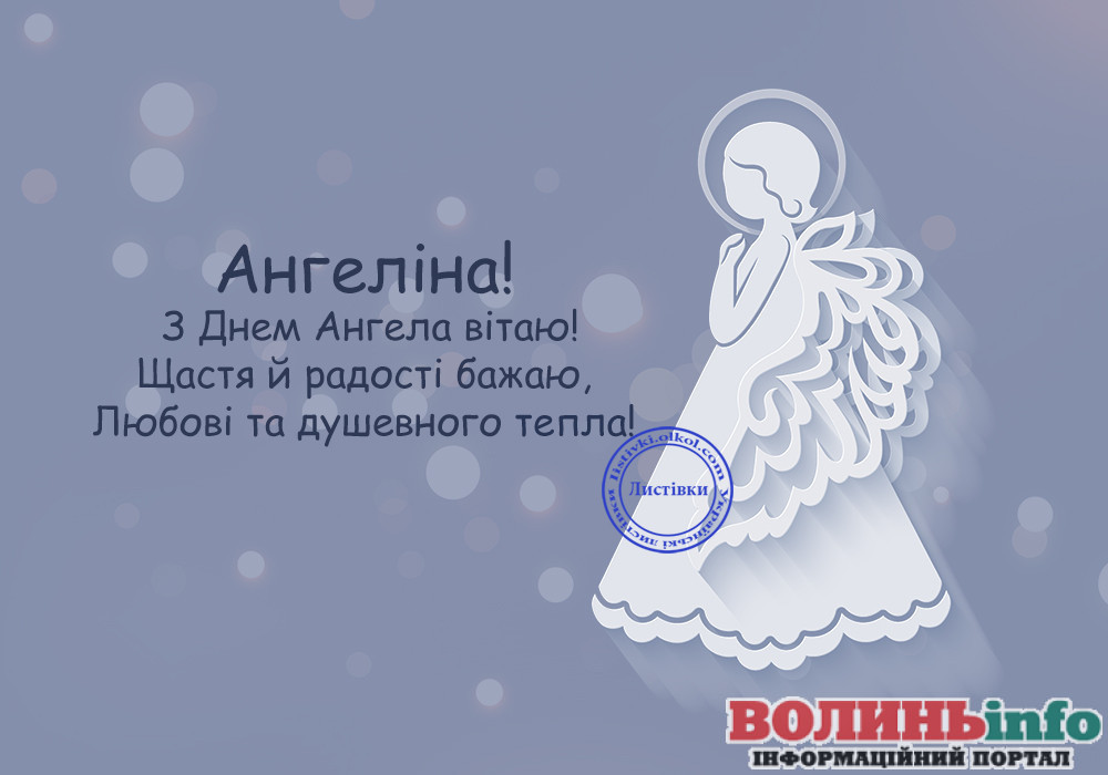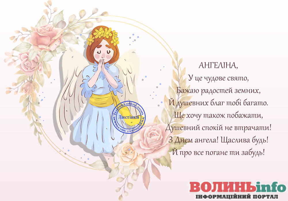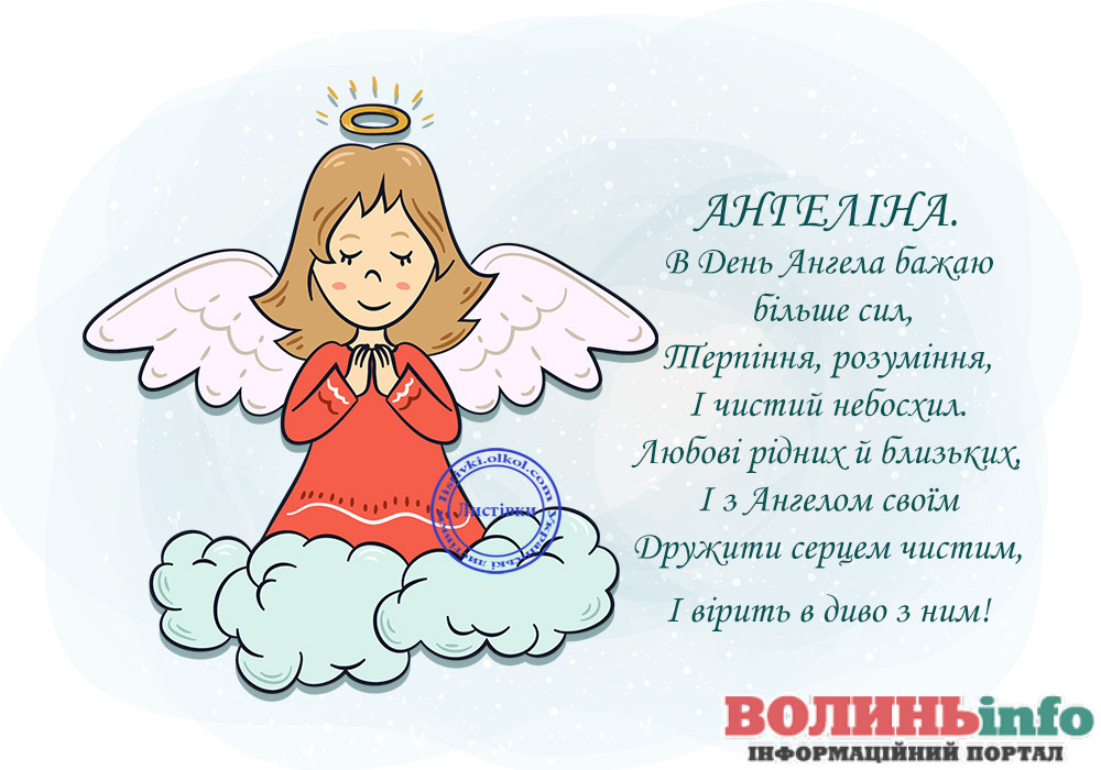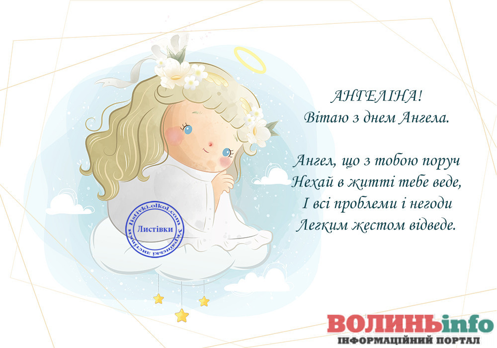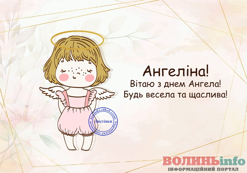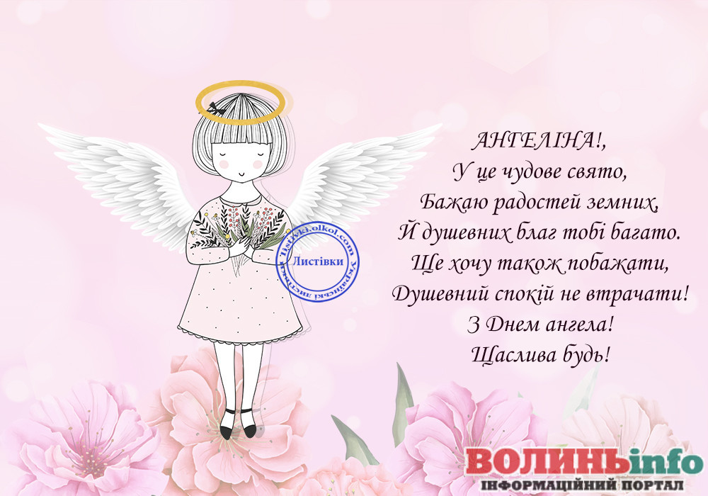 Ангеліно, з Днем Ангела! Бажаю, щоб твій Ангел завжди тебе оберігав і допомагав тобі у всіх твоїх справах — домашніх і робочих. Нехай усі починання будуть втілені в життя, а удача, процвітання та радість завжди ідуть поруч.