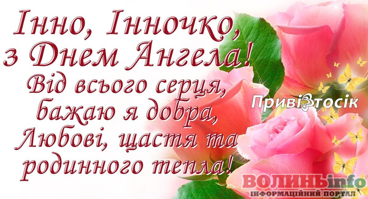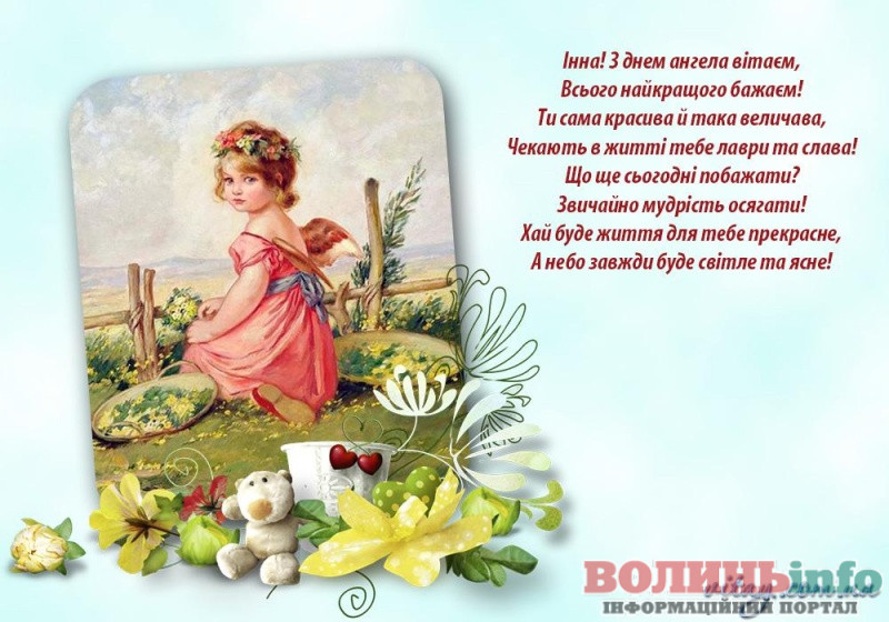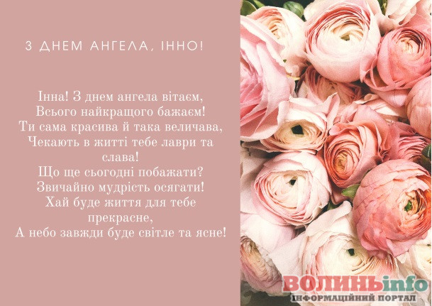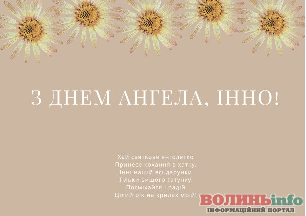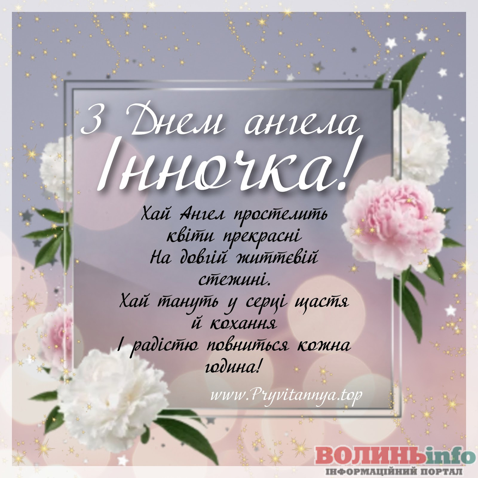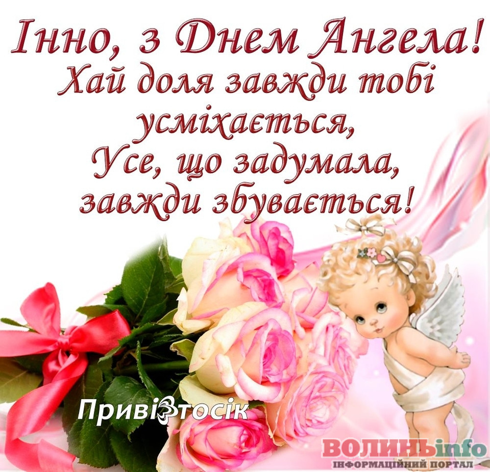 Вітаю тебе, Інно, зі святом іменин! Хай все у твоєму житті йде лише за твоїм планом, дрібні неприємності не збивають зі шляху, а ангел направляє тебе і допомагає у всьому. Хай поряд завжди будуть лише найкращі люди, мрії завжди збуваються, а кожен день приносить радість!
