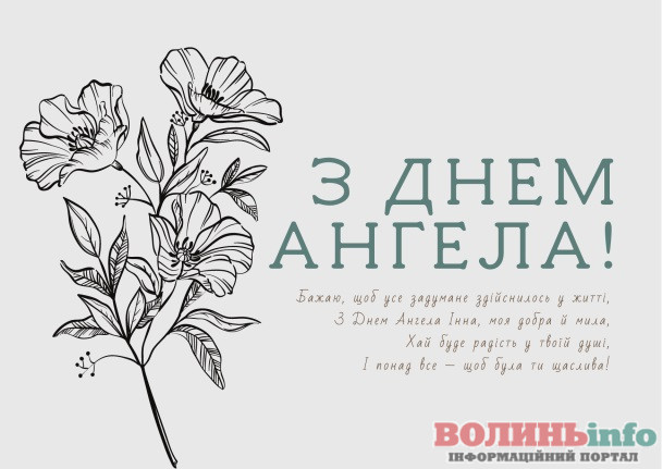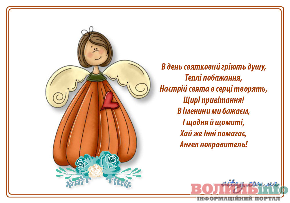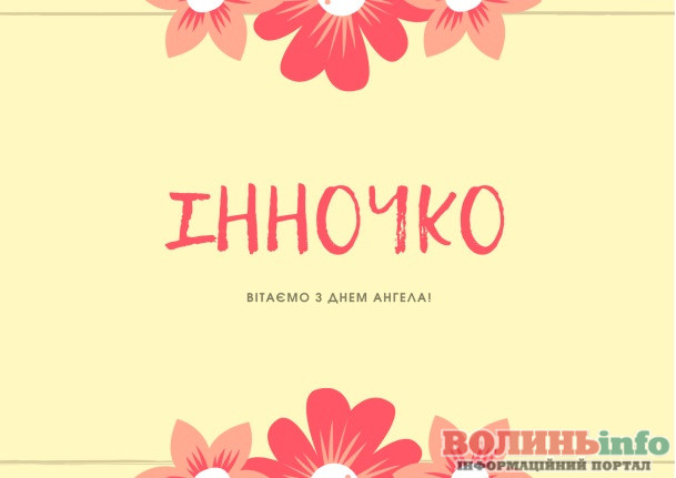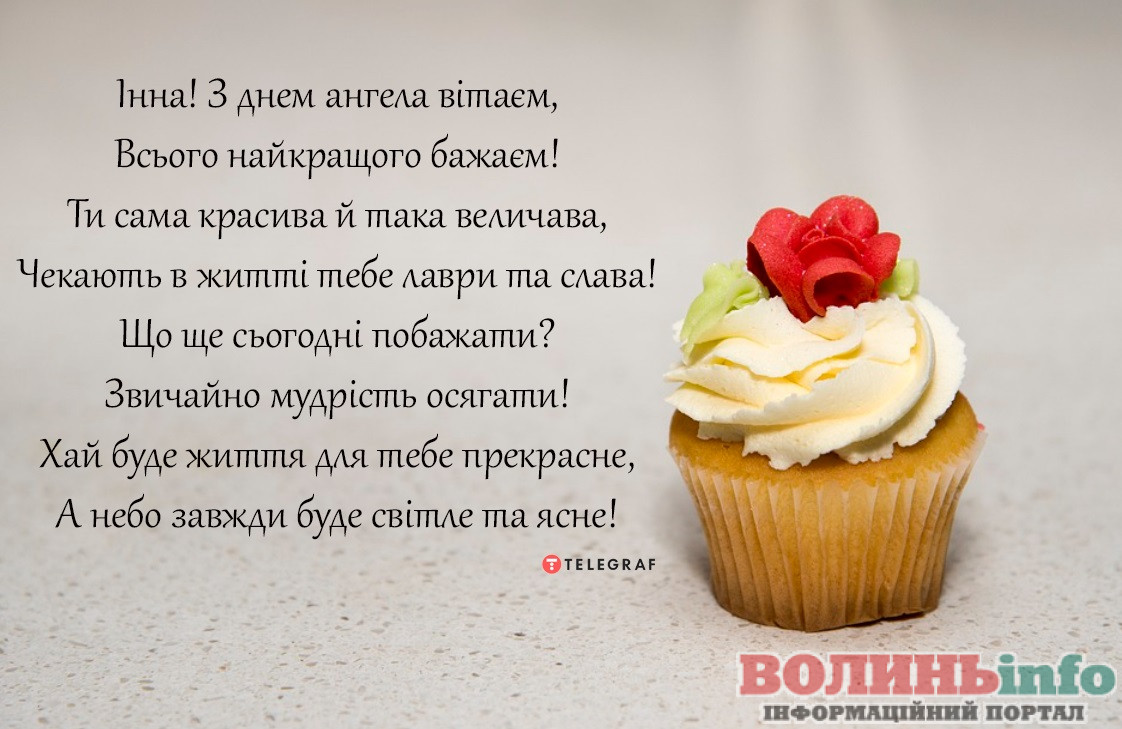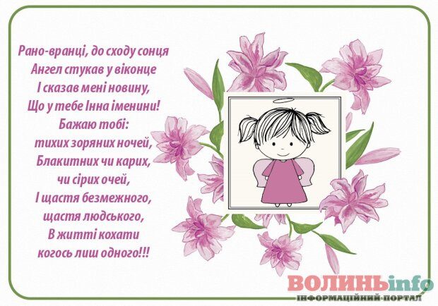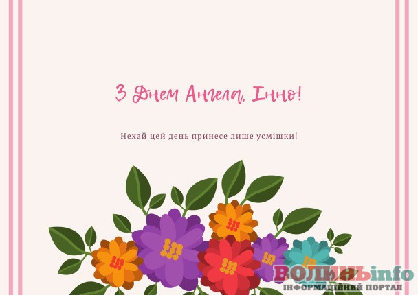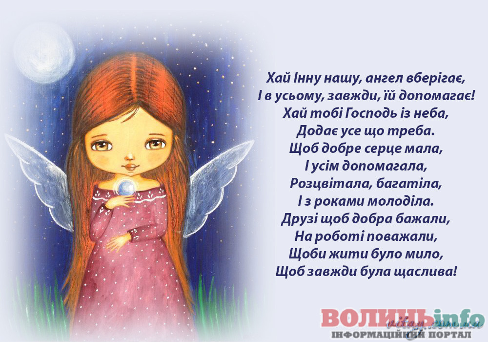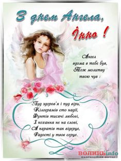 Вітаю тебе, Інно, зі святом іменин! Хай все у твоєму житті йде лише за твоїм планом, дрібні неприємності не збивають зі шляху, а ангел направляє тебе і допомагає у всьому. Хай поряд завжди будуть лише найкращі люди, мрії завжди збуваються, а кожен день приносить радість!
