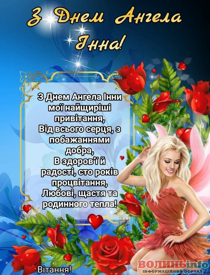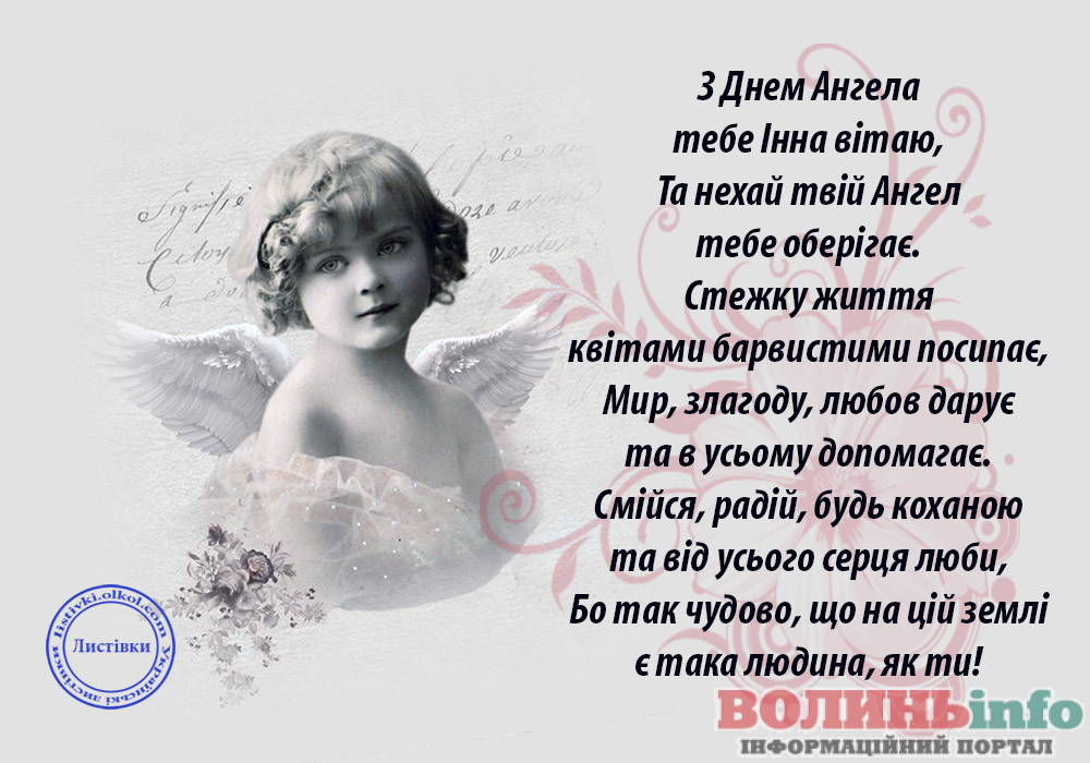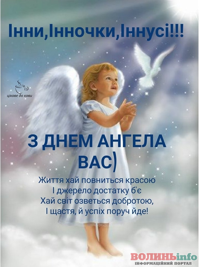 Вітаю, Інно, з Днем твого ангела!! Бажаю, щоб у житті все складалось так, як ти собі того бажаєш! Хай твій янгол-охоронець завжди турбується про тебе і не підпускає поганих людей. Хай сонце завжди сяє лише для тебе, а щастя ніколи не покидає серце.