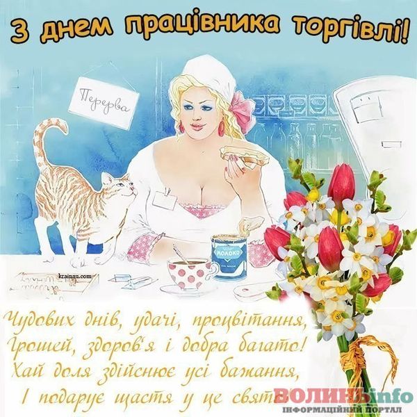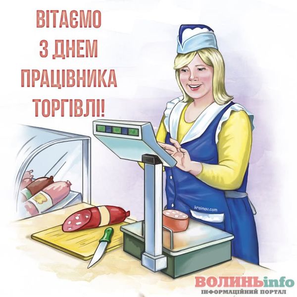 Вітаємо всіх працівників торгівлі! Бажаємо завжди бути у всеозброєнні і зустрічати численних покупців обеззброюючою посмішкою. Нехай в “Книзі відгуків і пропозицій” будуть тільки добрі слова. А стабільна виручка і постійні клієнти будуть доказом вашого успіху. Нехай ваші доходи завжди переважують чашу терезів доходів ваших конкурентів. Відмінної торгівлі і життєвого благополуччя.