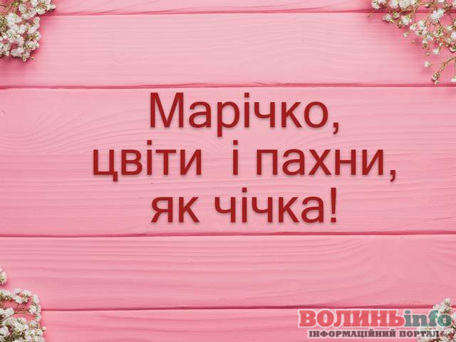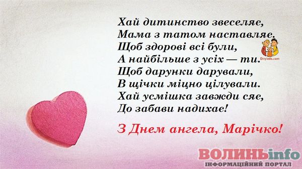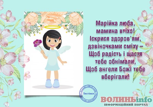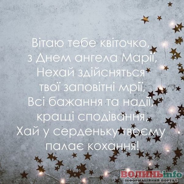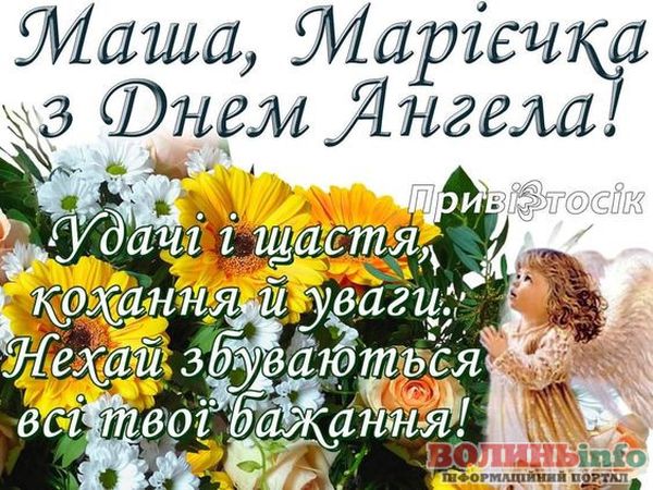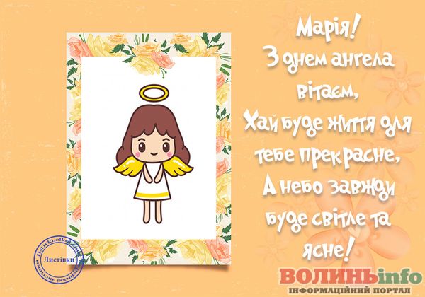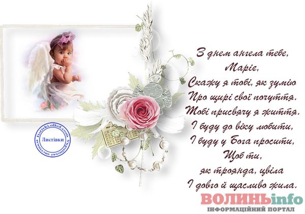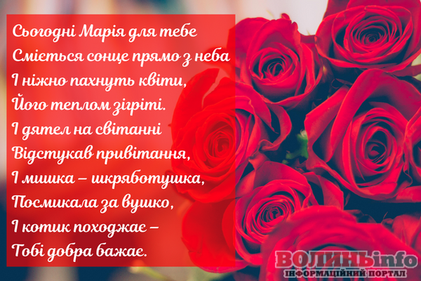 Маріє, вітаю з святом! Хочу подарувати тобі світлі побажання, моя хороша: нехай тебе оточують тільки добрі люди, хай доля завжди підносить тобі тільки приємні сюрпризи, а життя тішить радощами. Щастя тобі, успіхів і любові!