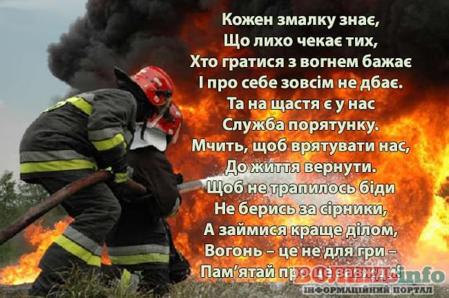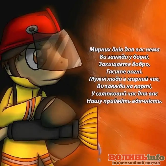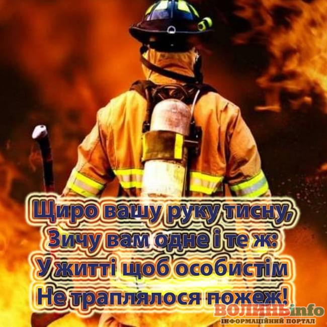 Вітаю всіх, хто щодня робить неможливе. Тих, хто, ризикуючи життям, може впоратися з найстрашнішою і небезпечною стихією. Тих, хто рятує безліч людських життів, часом забуваючи про своє власне. Дорогі наші пожежники! Ми віддаємо вам честь і хвалу. Нехай у кожного з вас буде найщасливіша доля. Адже тільки щастя і благополуччя можуть стати гідною нагородою за вашу серйозну і героїчну працю. З Днем пожежників!