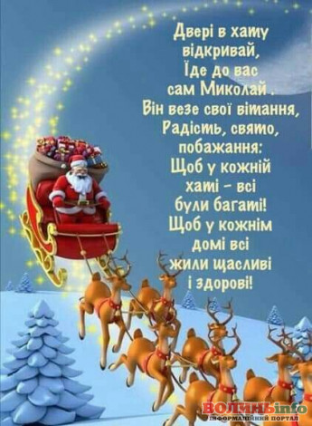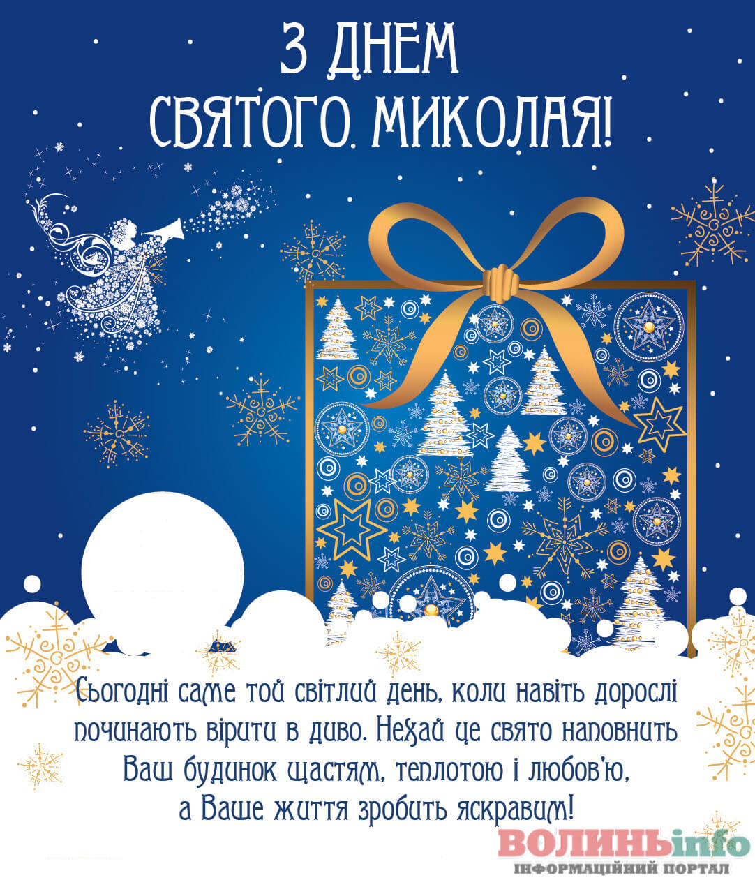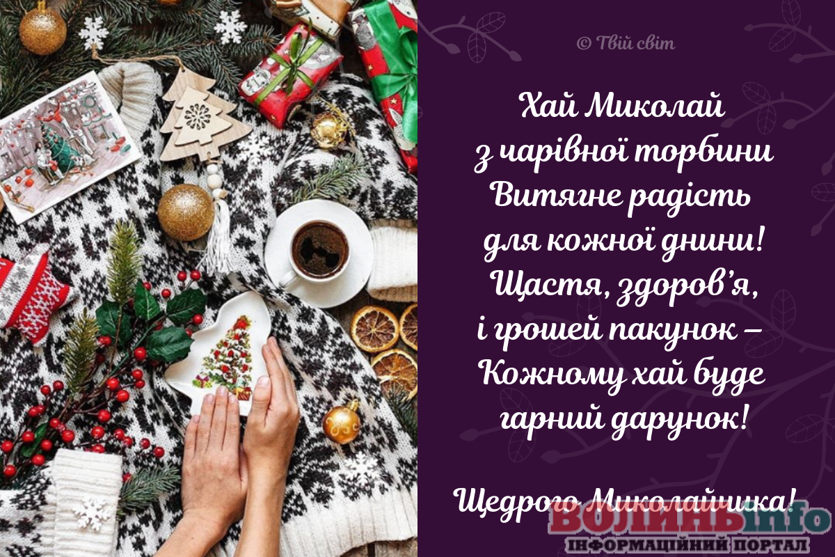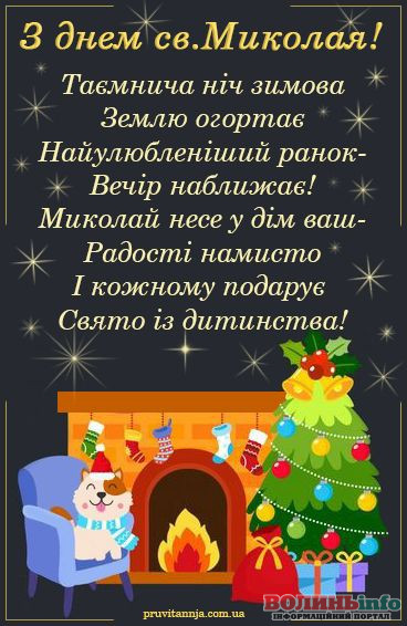 Вітаю з Днем Святого Миколая! Нехай сьогодні в твоєму житті почнеться нова історія, в якій буде радість і удача, посмішки і пісні, рідні та друзі, солодкі моменти любові і щасливі миті в колі сім’ї.
