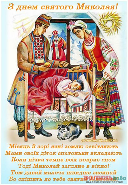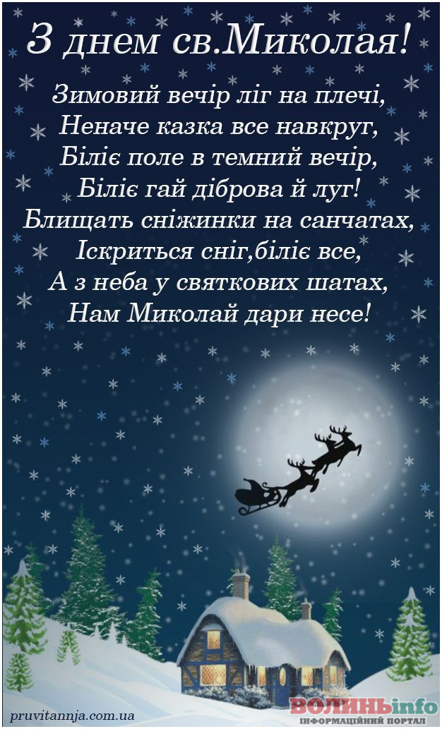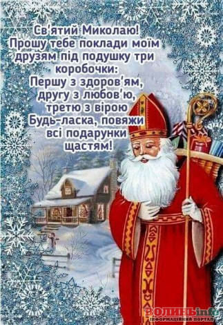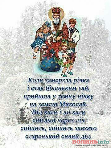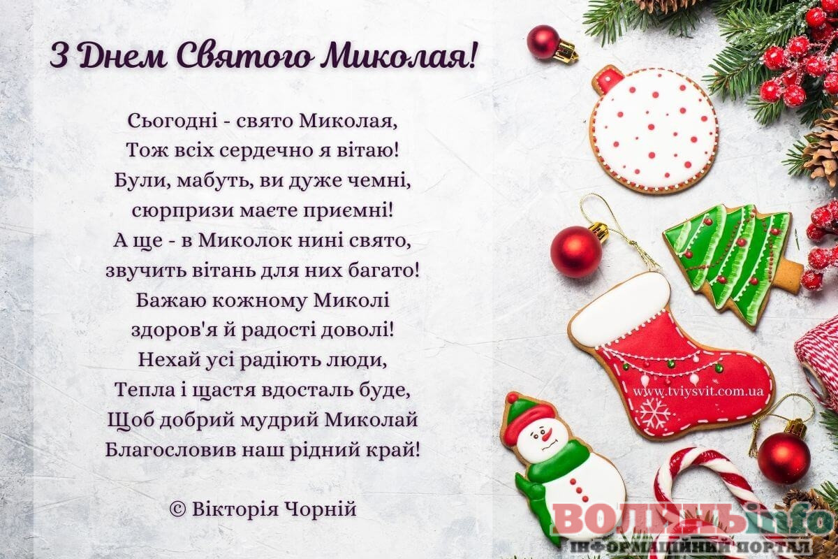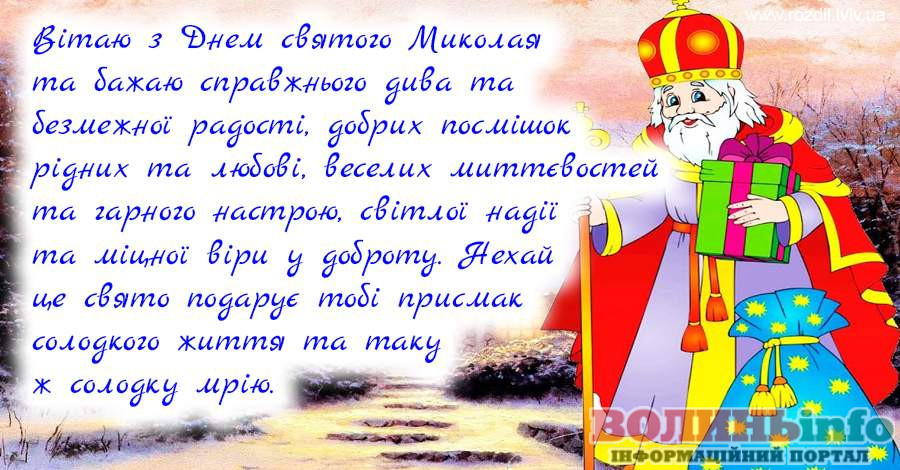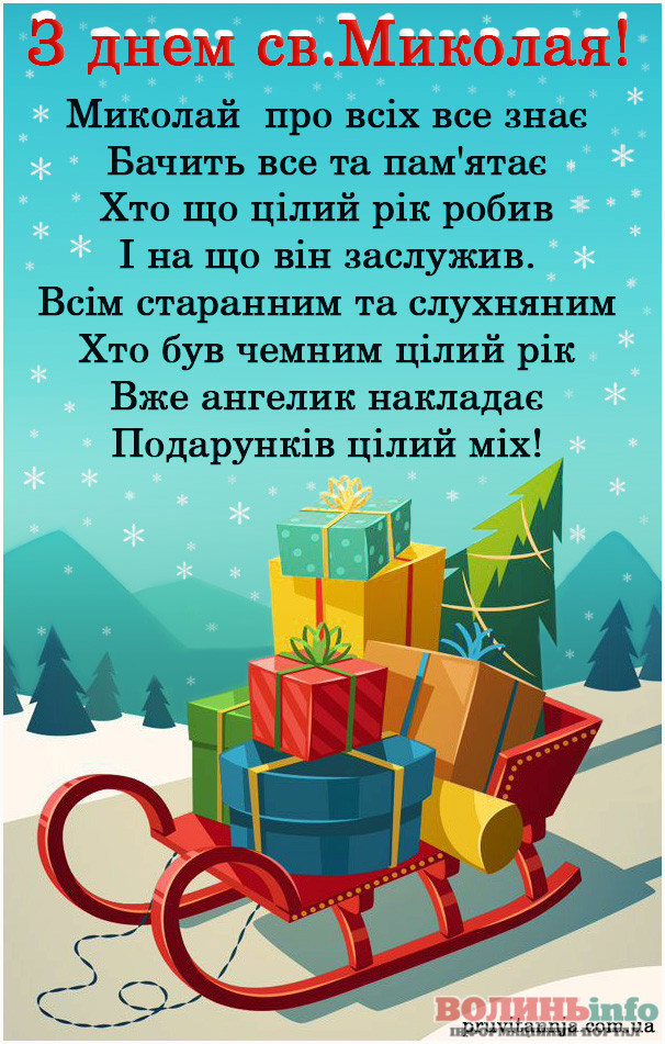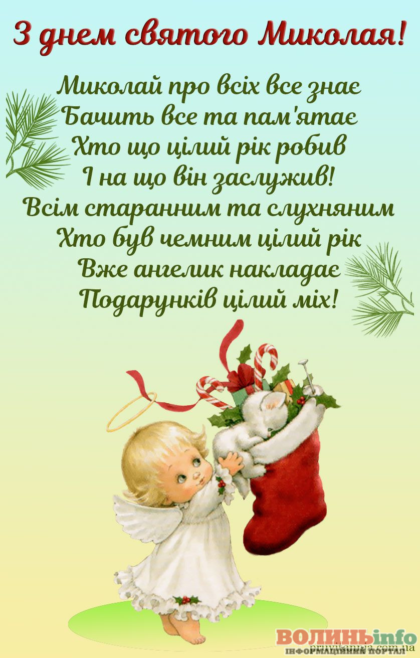 З Днем святого Микола сердечно вітаю! Бородатий старічокПрінесет нехай сундучок.В ньому – добра, любові, удачі здоров’я вам на додачу, А ще – посмішок, смехаІ достатку, і успіху.
