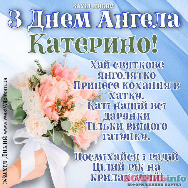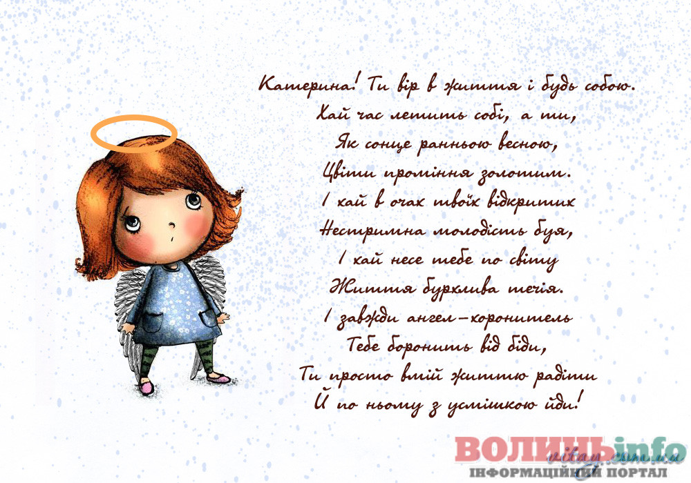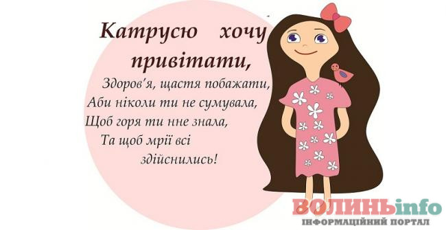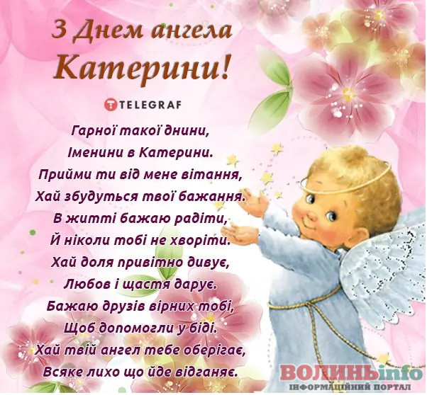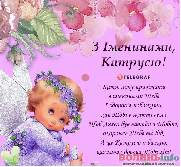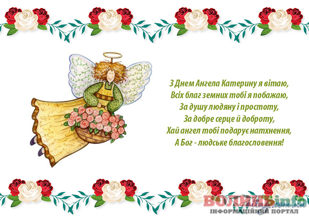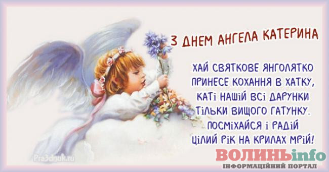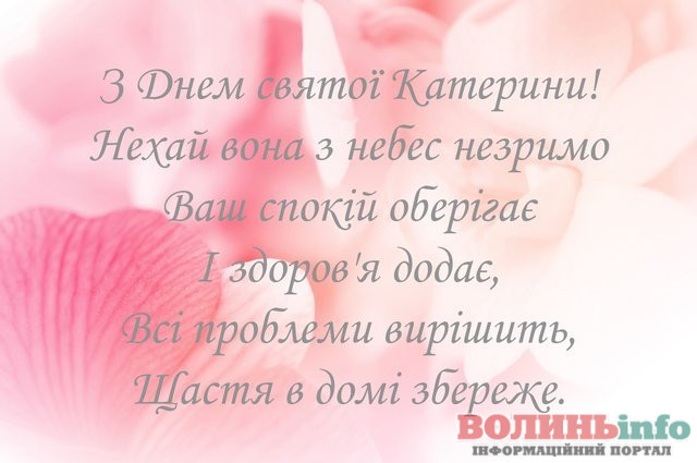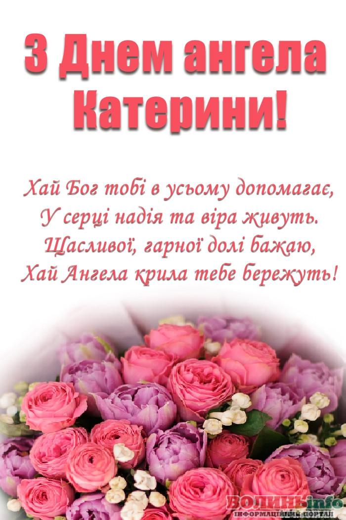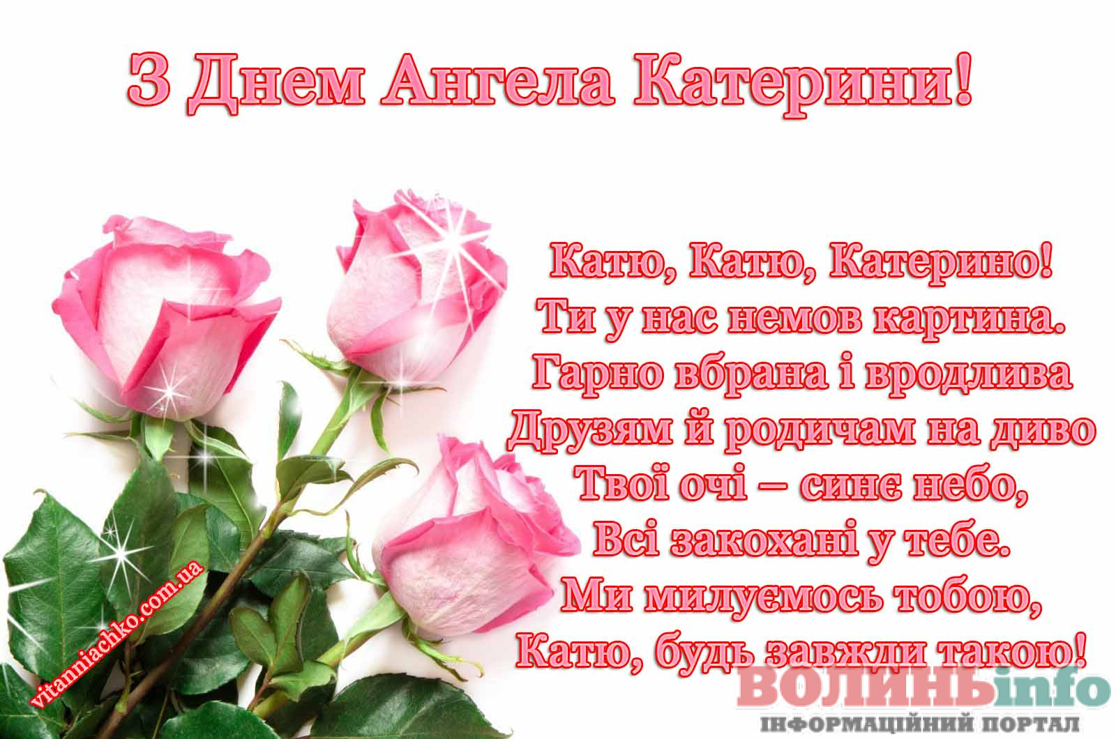 Катерина, Катруся, Катюша! Прийми мої щирі вітання з твоїм днем Ангела! Твоя покровителька — свята Катерина — завжди допомагає дівчатам, тому бажаю тобі жіночого щастя! Нехай у твоєму житті буде багато любові і ніжності, гармонії і взаєморозуміння. Бажаю тобі побільше добра і щоб всі твої мрії збулися!