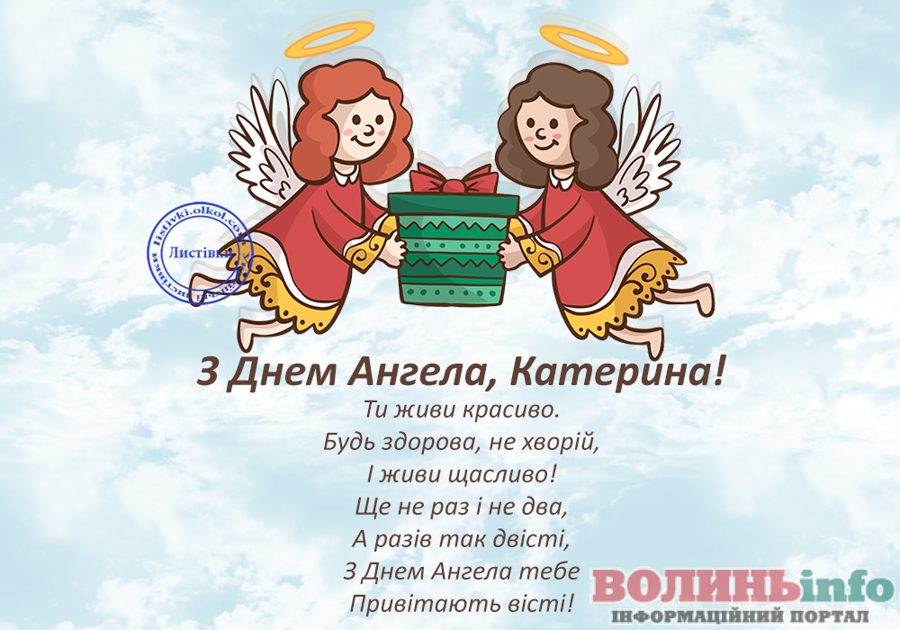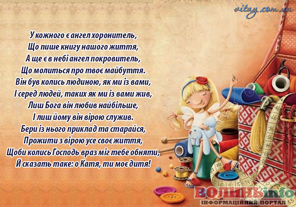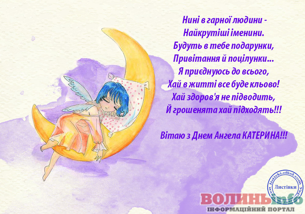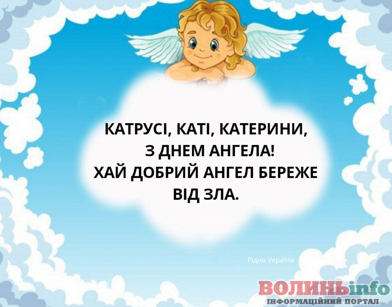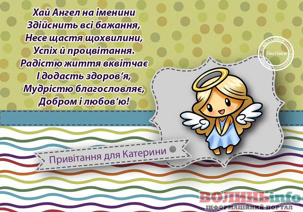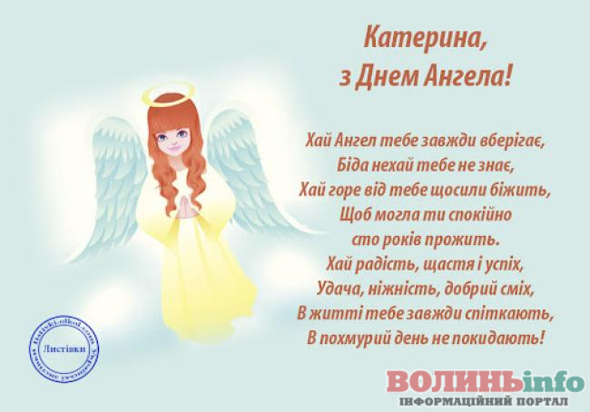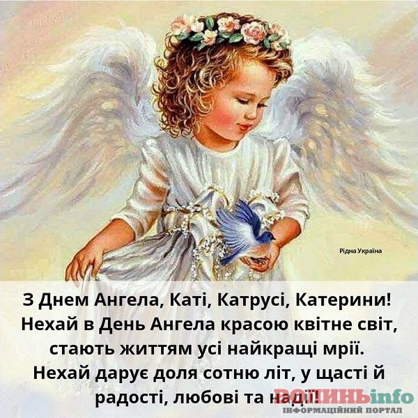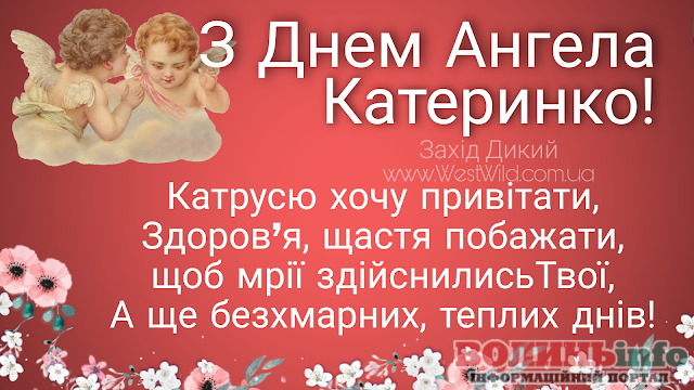 Катерина, Катруся, Катюша! Прийми мої щирі вітання з твоїм днем Ангела! Твоя покровителька — свята Катерина — завжди допомагає дівчатам, тому бажаю тобі жіночого щастя! Нехай у твоєму житті буде багато любові і ніжності, гармонії і взаєморозуміння. Бажаю тобі побільше добра і щоб всі твої мрії збулися!