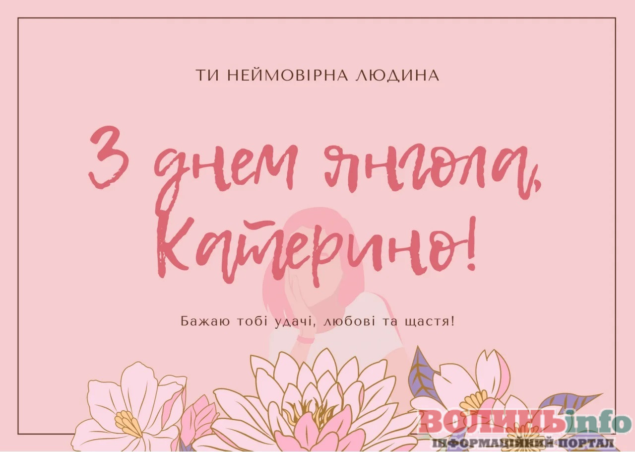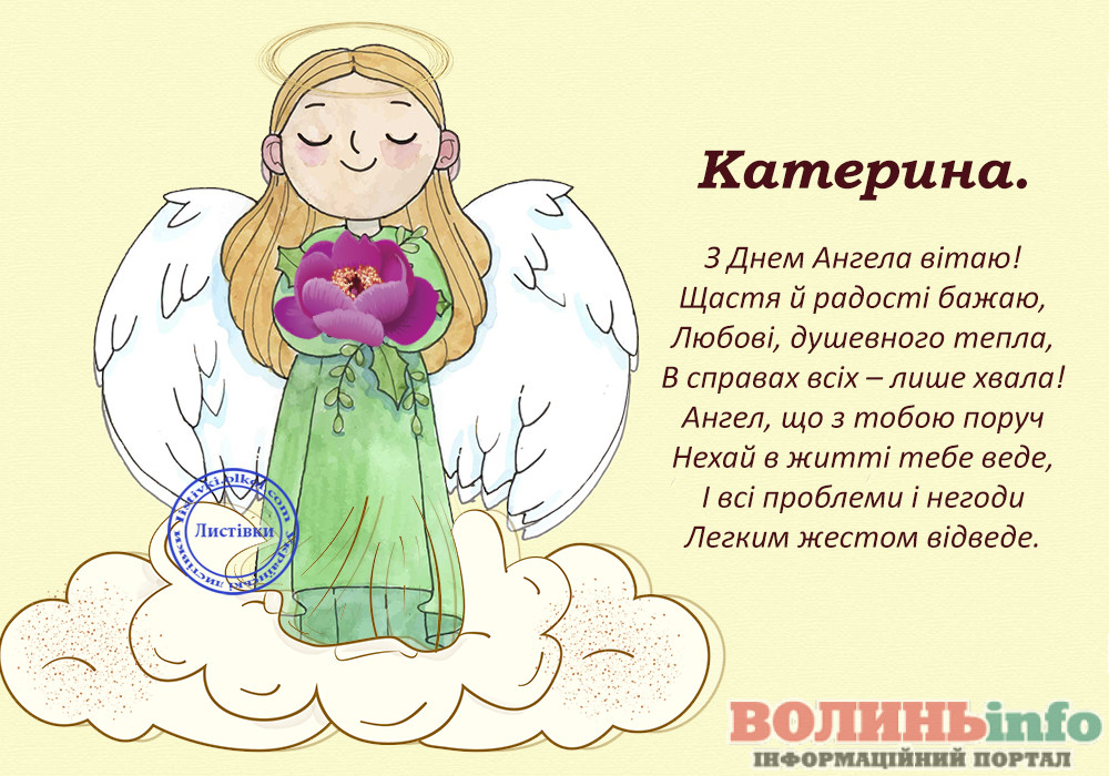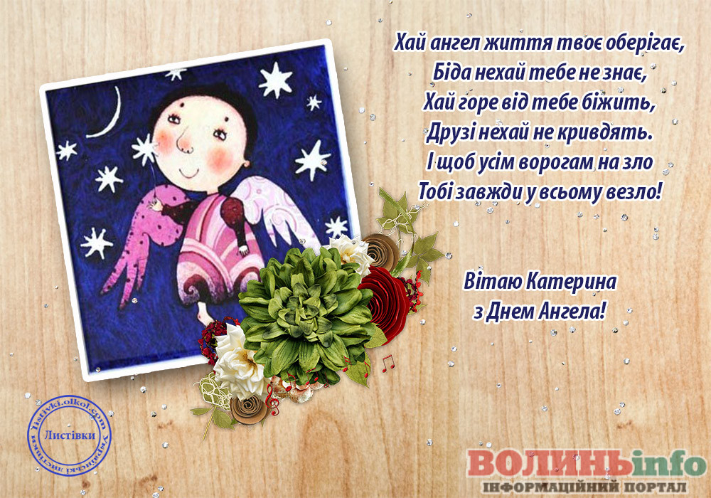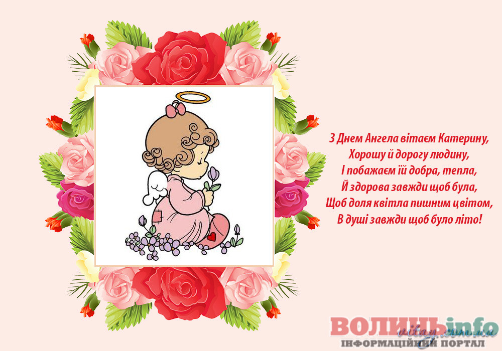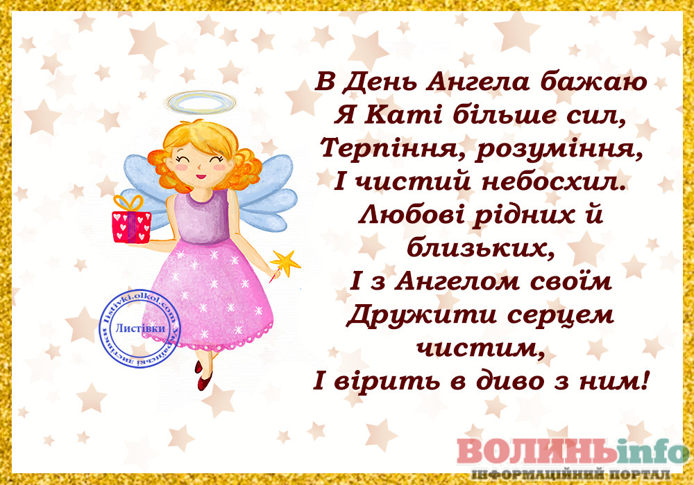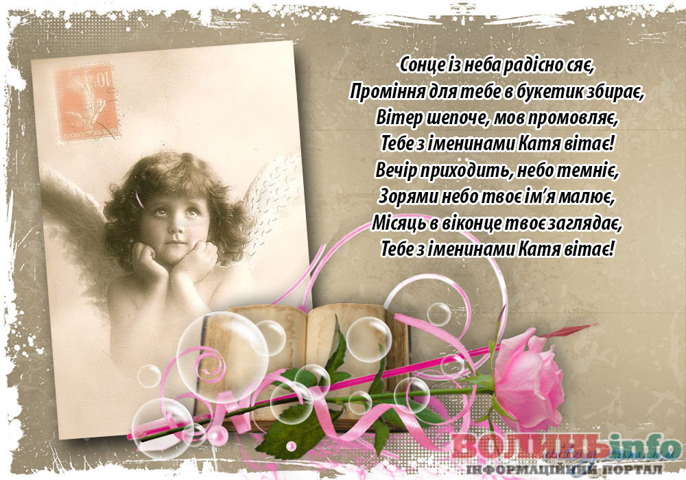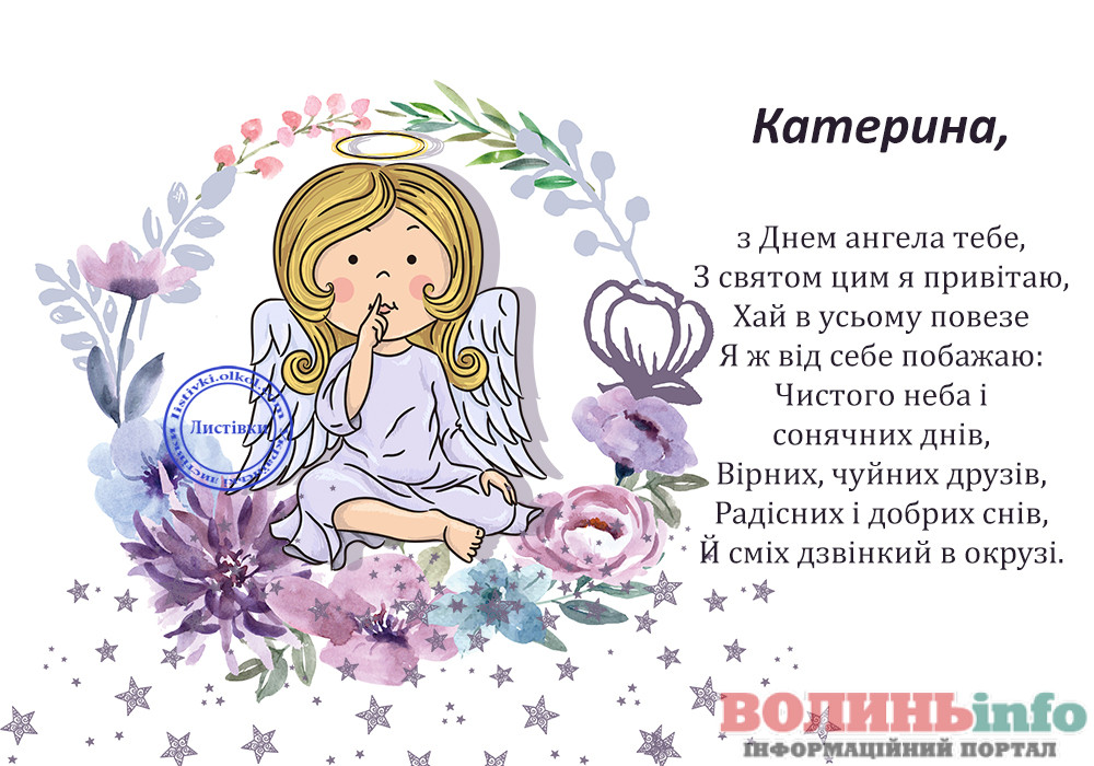 Катерина, Катруся, Катюша! Прийми мої щирі вітання з твоїм днем Ангела! Твоя покровителька — свята Катерина — завжди допомагає дівчатам, тому бажаю тобі жіночого щастя! Нехай у твоєму житті буде багато любові і ніжності, гармонії і взаєморозуміння. Бажаю тобі побільше добра і щоб всі твої мрії збулися!