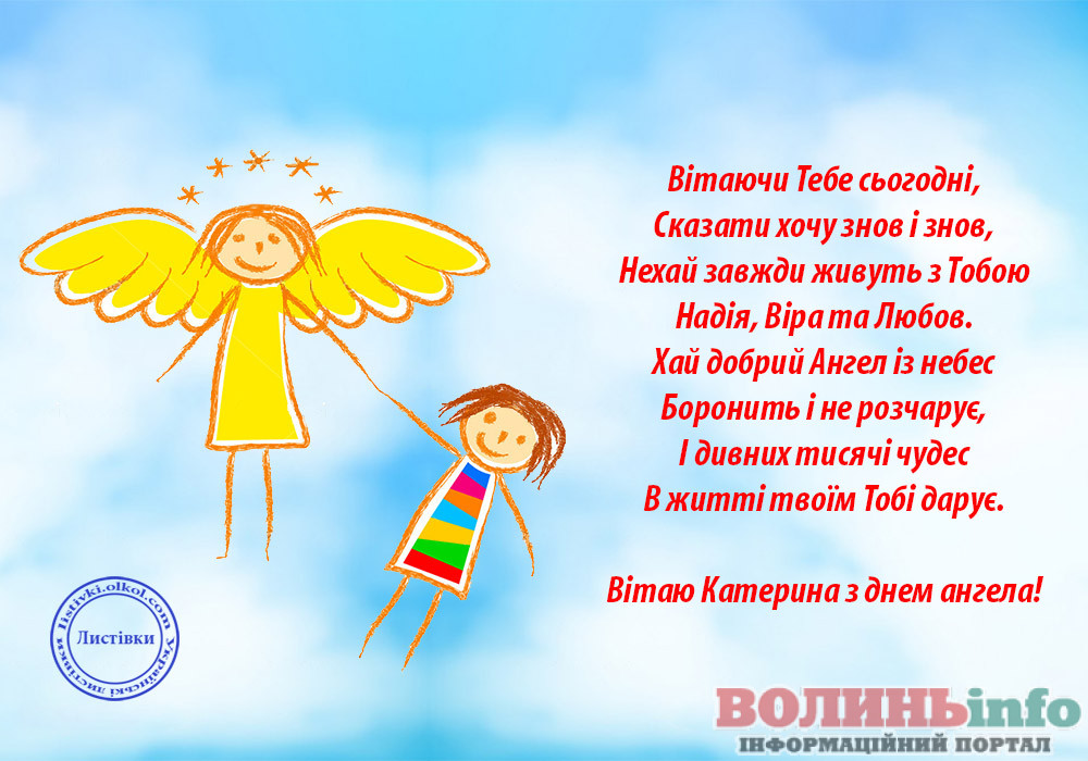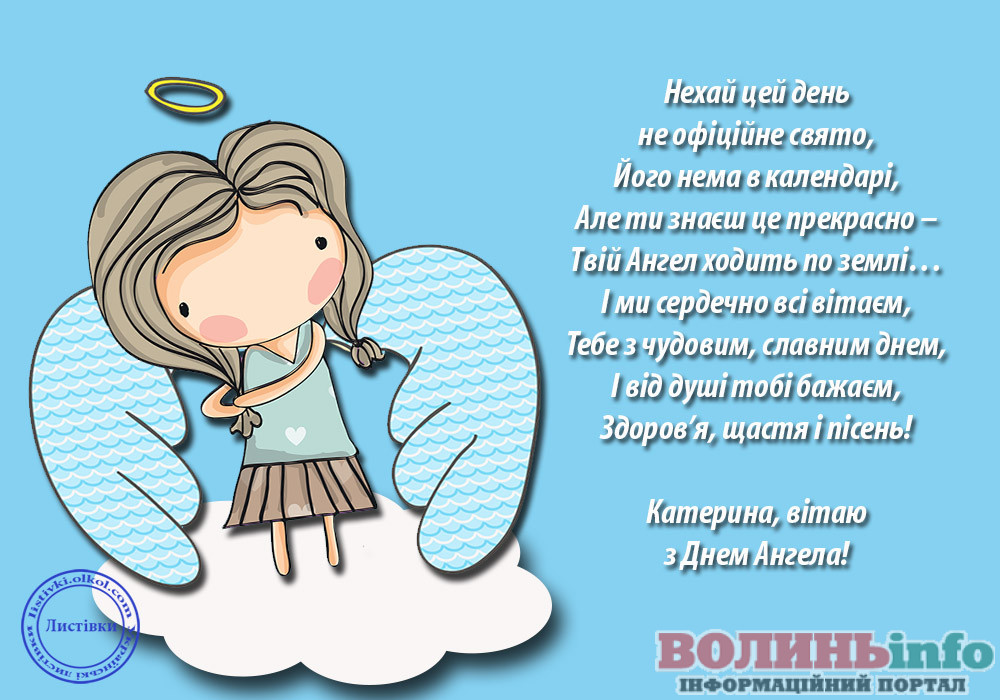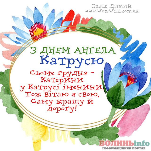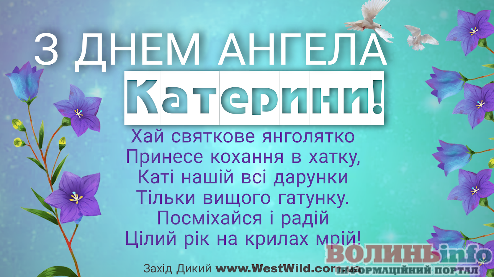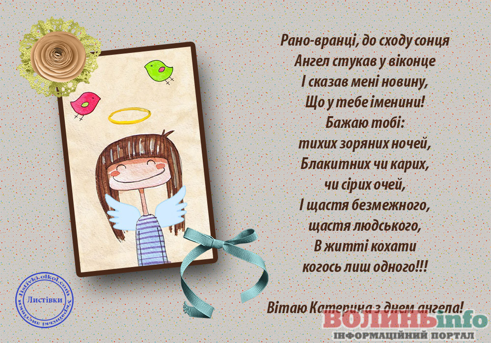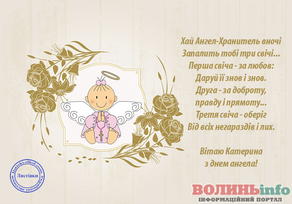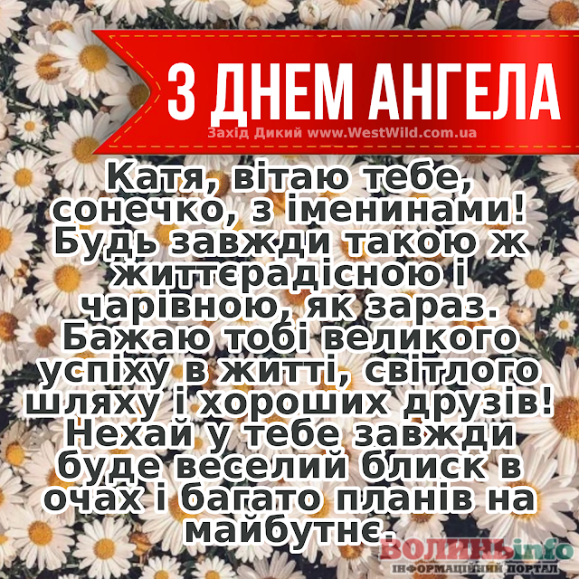 Катерина, Катруся, Катюша! Прийми мої щирі вітання з твоїм днем Ангела! Твоя покровителька — свята Катерина — завжди допомагає дівчатам, тому бажаю тобі жіночого щастя! Нехай у твоєму житті буде багато любові і ніжності, гармонії і взаєморозуміння. Бажаю тобі побільше добра і щоб всі твої мрії збулися!