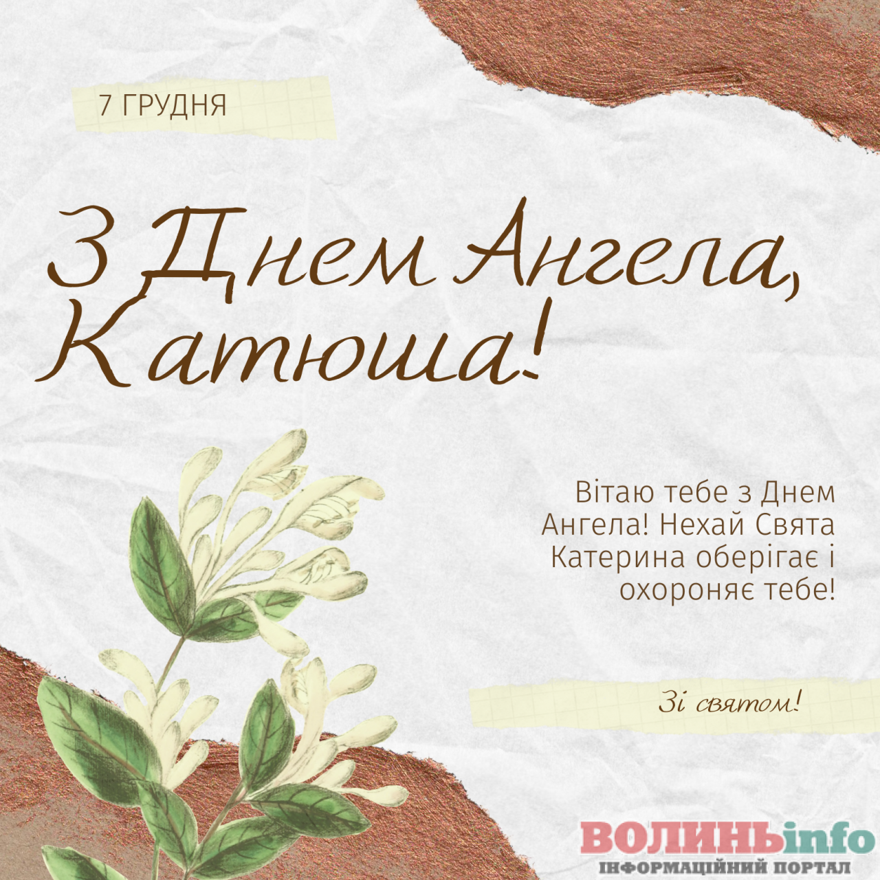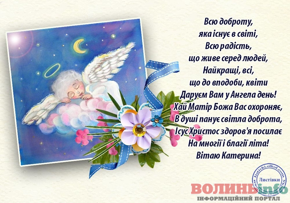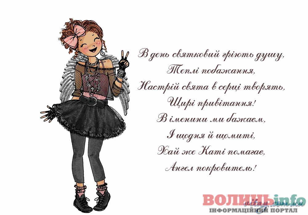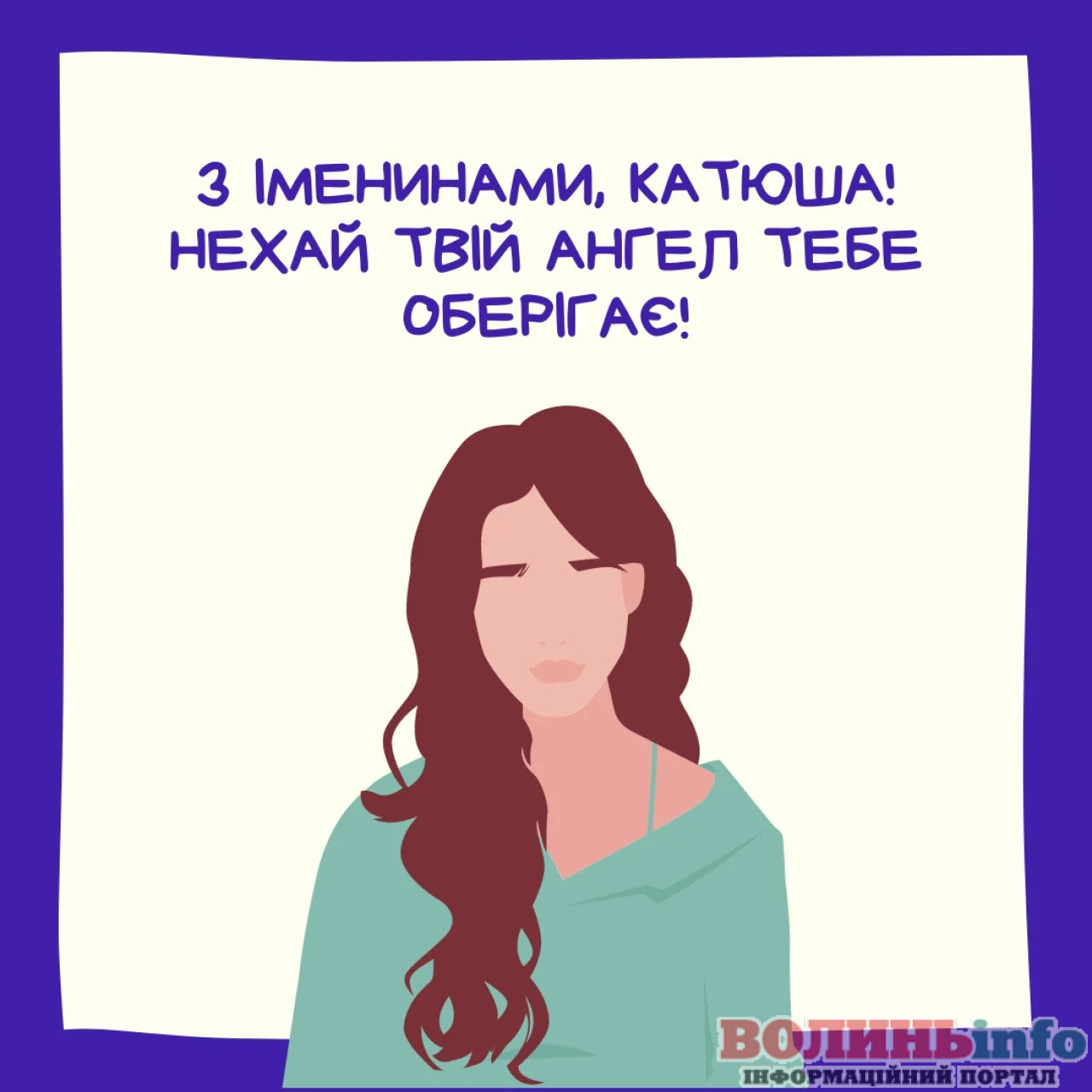Дорога Катюша, вітаю тебе з Днем Ангела! Нехай твоя покровителька, свята Катерина, оберігає тебе від життєвих негараздів і невдач. Нехай вона завжди буде з тобою і береже від поганих людей і неприємних ситуацій. Бажаю побільше щастя, радості і посмішок! Любові і гармонії!