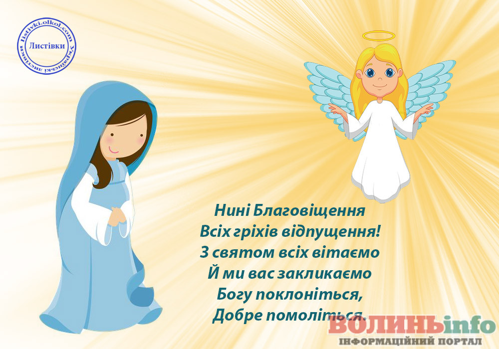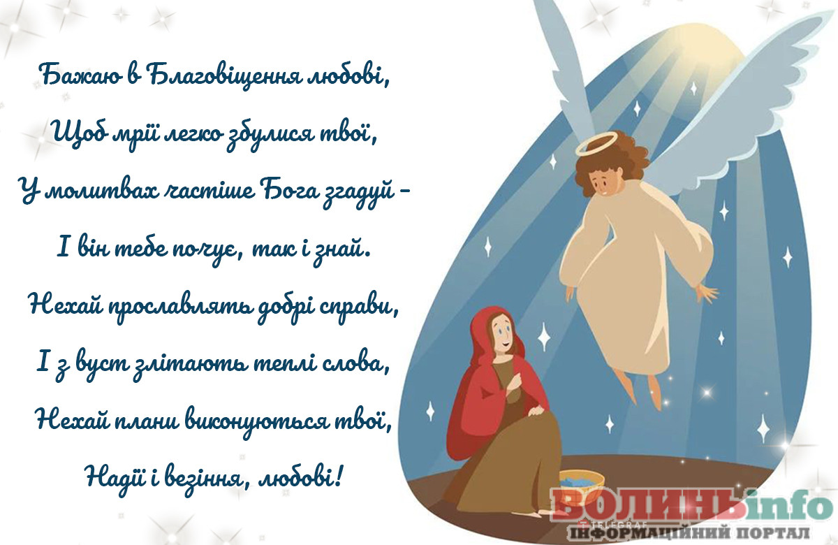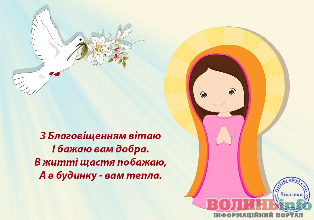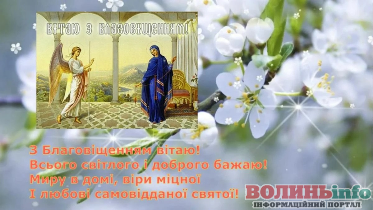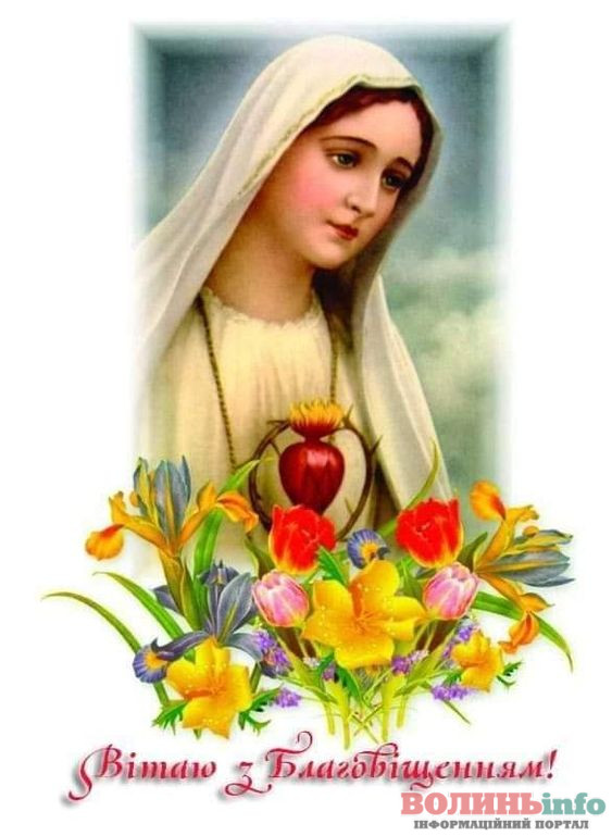 Нехай Матір Божа благодаттю своєю покриє вас і весь ваш будинок. Щоб недруг злий або зрадник не оселився в ньому. Нехай Свята Богоматір у день Благовіщення врятує і нехай все те, що чисте та святе приносить вам радість та щастя!
