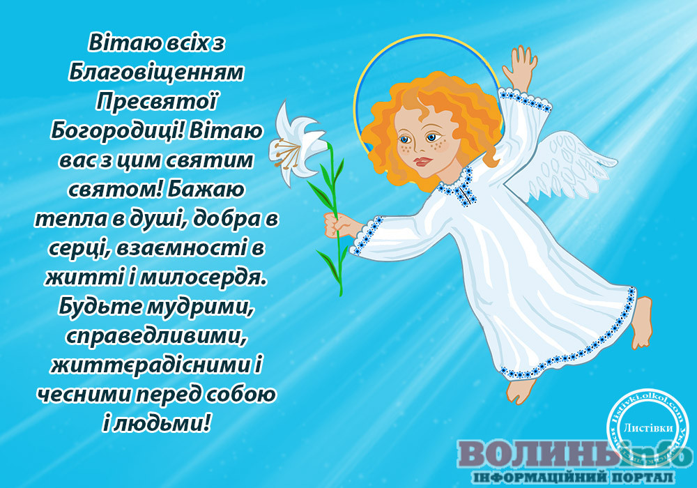 Вітаю з Благовіщенням Пресвятої Богородиці і всім серцем бажаю давати відсіч сумним думкам і недобрим помислам, впевнено прагнути до чогось світлого і доброго, жити з щирою надією і міцною вірою, радіти всьому, що Бог послав, і дякувати його за добро і щастя.