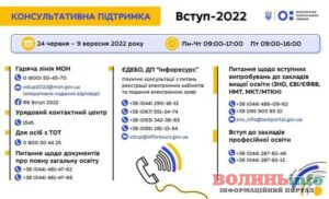 На період вступної кампанії (24 червня – 9 вересня 2022 року) розпочала роботу консультативна телефонна лінія МОН «Вступна кампанія 2022 року». У зазначені строки також приймаються звернення громадян.