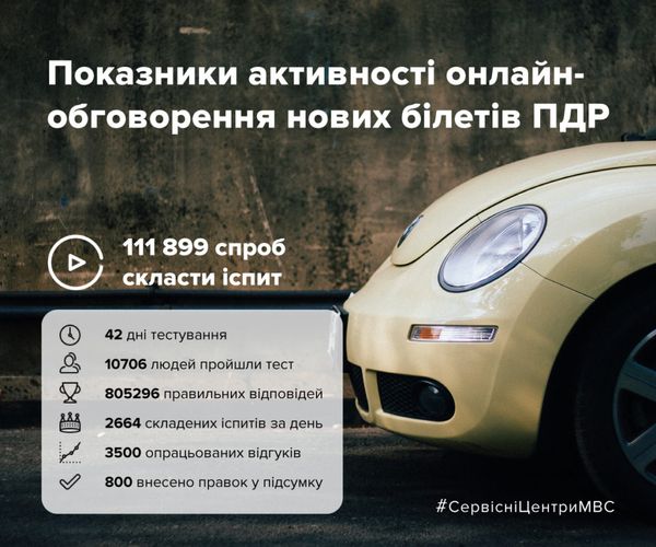 Протягом березня та квітня кожен охочий міг переглянути екзаменаційні білети з ПДР та написати свої пропозиції щодо їх вдосконалення. Загалом тестовою версією білетів ПДР скористались 111 899 разів.