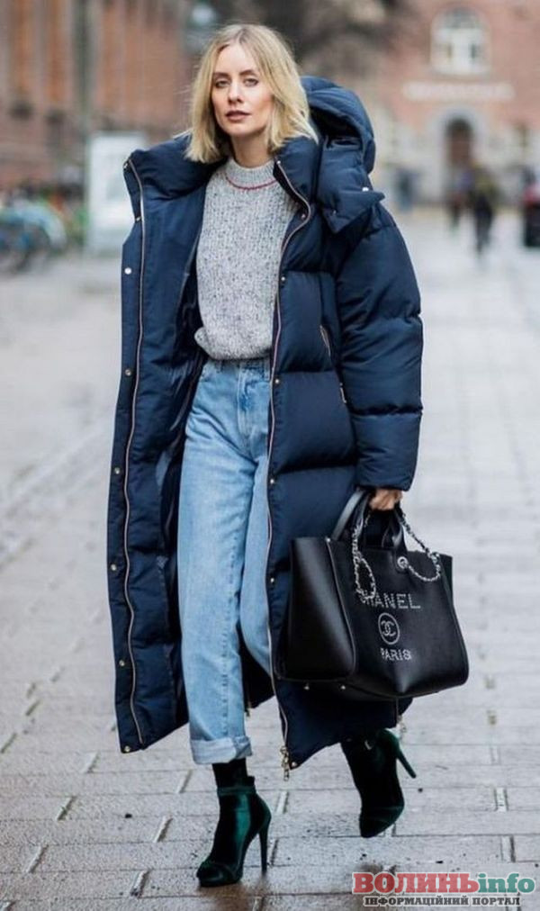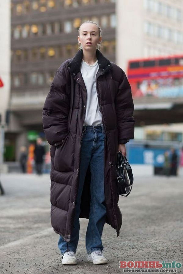 2. Довгий пуховик і короткі черевики на тонкій підошві