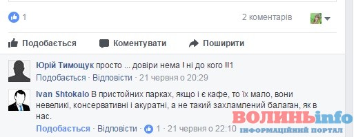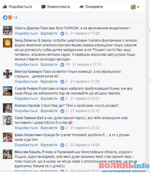 Інформаційний портал «Волинь.info» вирішив поцікавитися думкою лучан щодо того, чи повинні бути у парку кафе. Опитували у найпопулярніших групах Луцька у соціальній мережі «Фейсбук». Більшість лучан негативно налаштовані проти кафе у парках і потребують там зовсім інших речей.