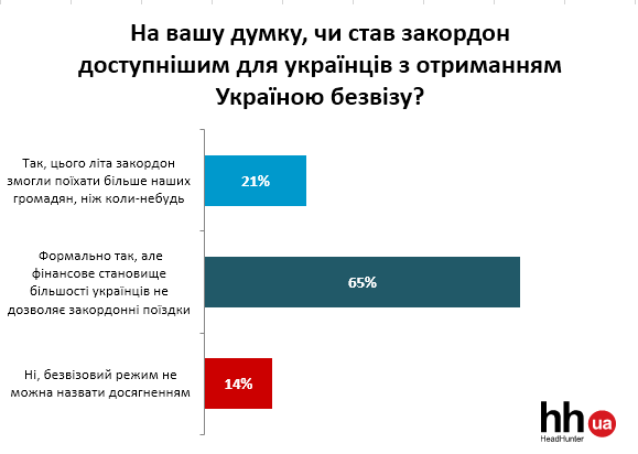 Більшість респондентів, а саме 65% від загального числа опитаних, зазначають, що отримання Україною безвізу дійсно зробило закордон більш доступною для українців, але тільки формально. Разом з тим, одна п’ята респондентів впевнена, що завдяки введенню безвізового режиму, цього літа країни Європи змогло відвідати значно більше наших громадян, ніж будь-коли. Однак, 14% учасників опитування вважають, що нові спрощені умови перетину кордонів ніяк не вплинули на доступність зарубіжних країн для українців.