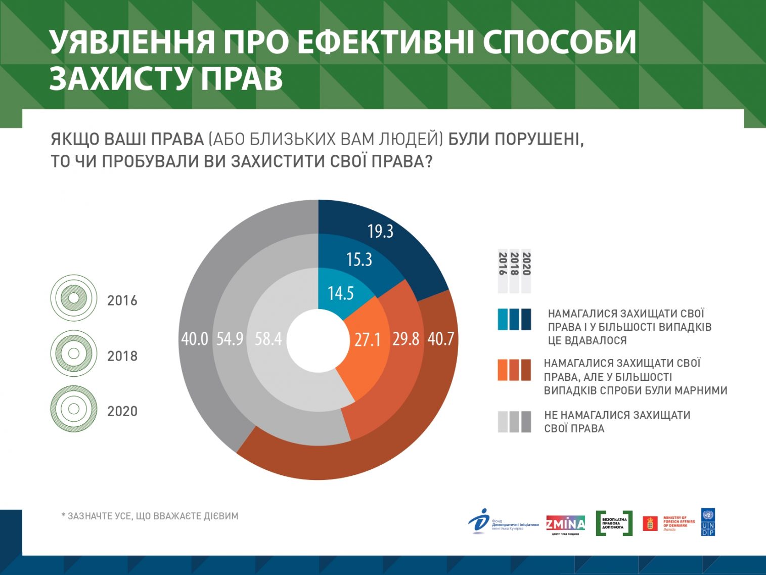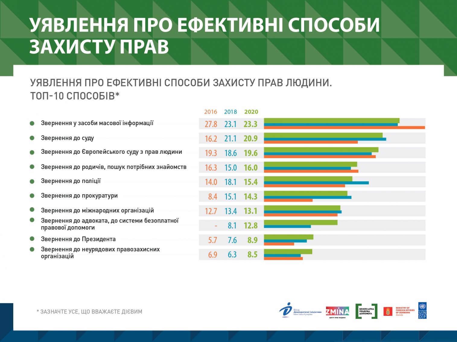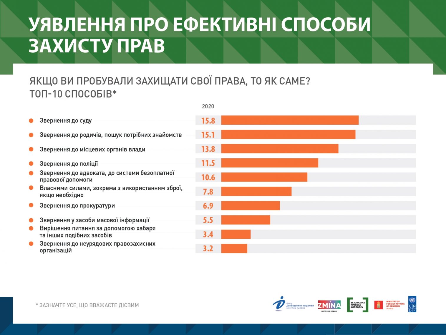 Загалом, упродовж 2018–2020 років дещо змінилось уявлення українців про ефективні способи захисту своїх прав. Серед опитаних стало менше тих, хто вважає дієвим вирішення проблеми власними силами, включно з використанням зброї (–4,9%) та хабаря (–2,5%). Натомість збільшилася частка респондентів, які впевнені у ефективності звернення до системи безоплатної правової допомоги (+4,7%). Це свідчить про зростання довіри населення до сервісів системи та про якість надання правових послуг.