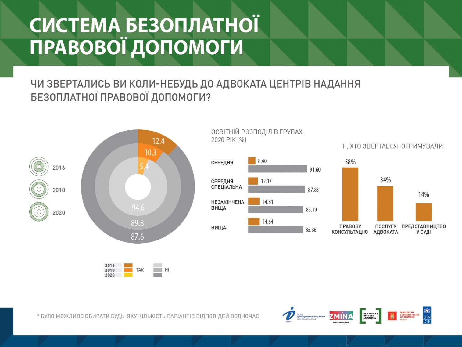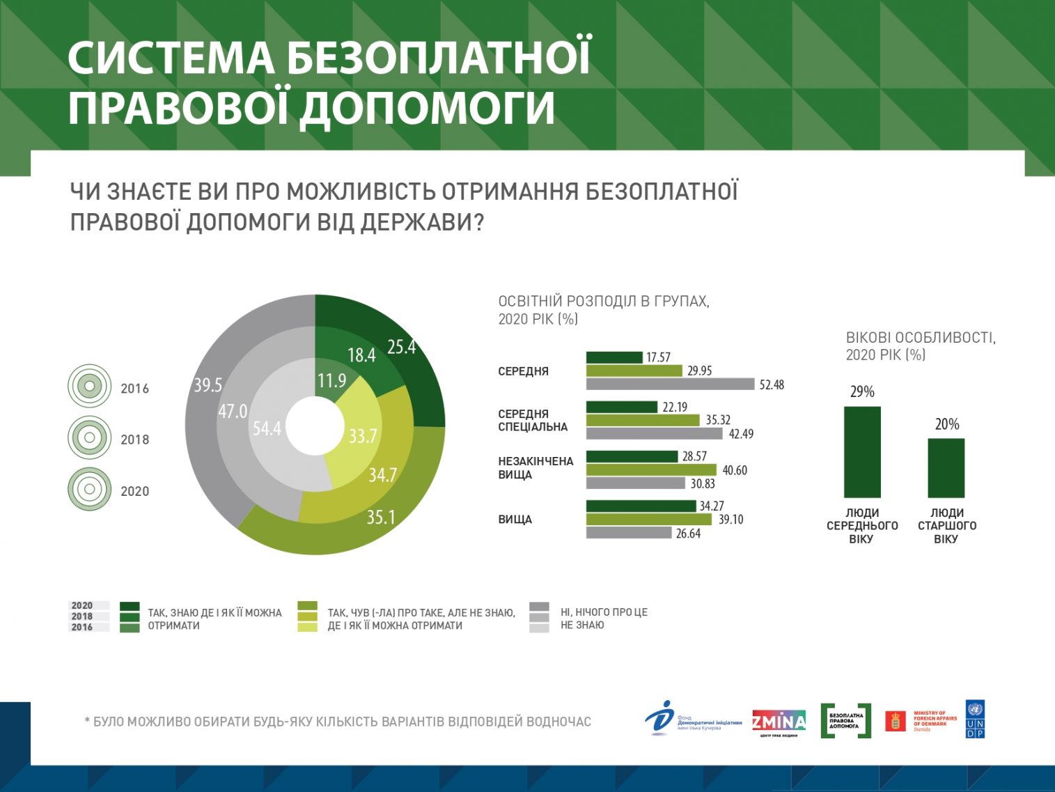 Останніми роками суттєво збільшився рівень поінформованості українців про можливість отримання безоплатної правової допомоги. Якщо у 2016 році менше 12% респондентів відповіли, що знають про систему БПД, то під час останнього опитування ствердно відповіли вже понад 25%.