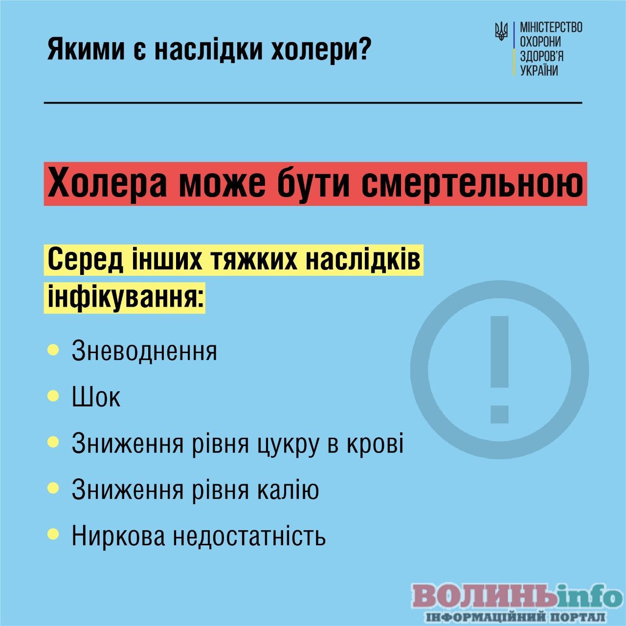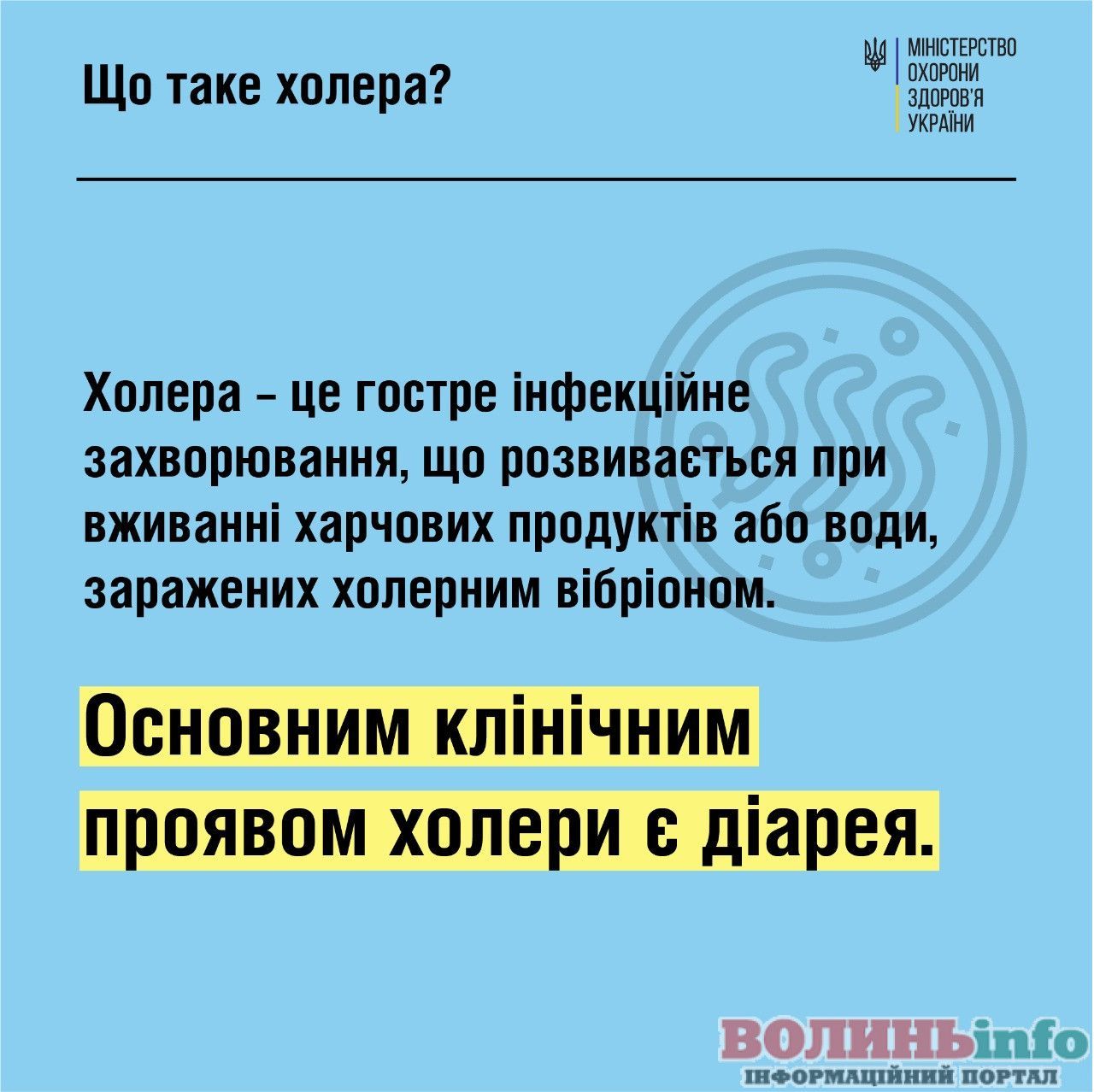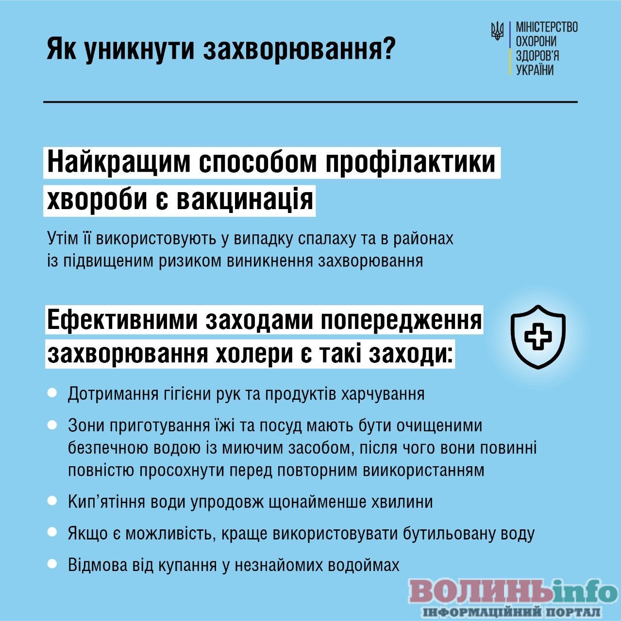 МОЗ надає інформацію (у вкладенні), які є прояви інфекційного захворювання та його наслідки, а також що потрібно знати, щоб вберегтися від зараження холерою.