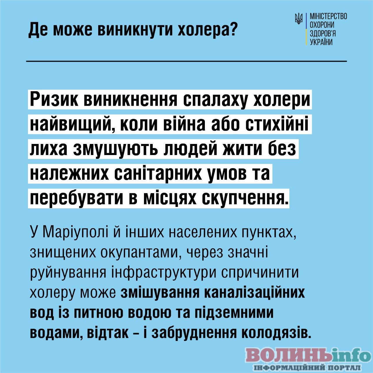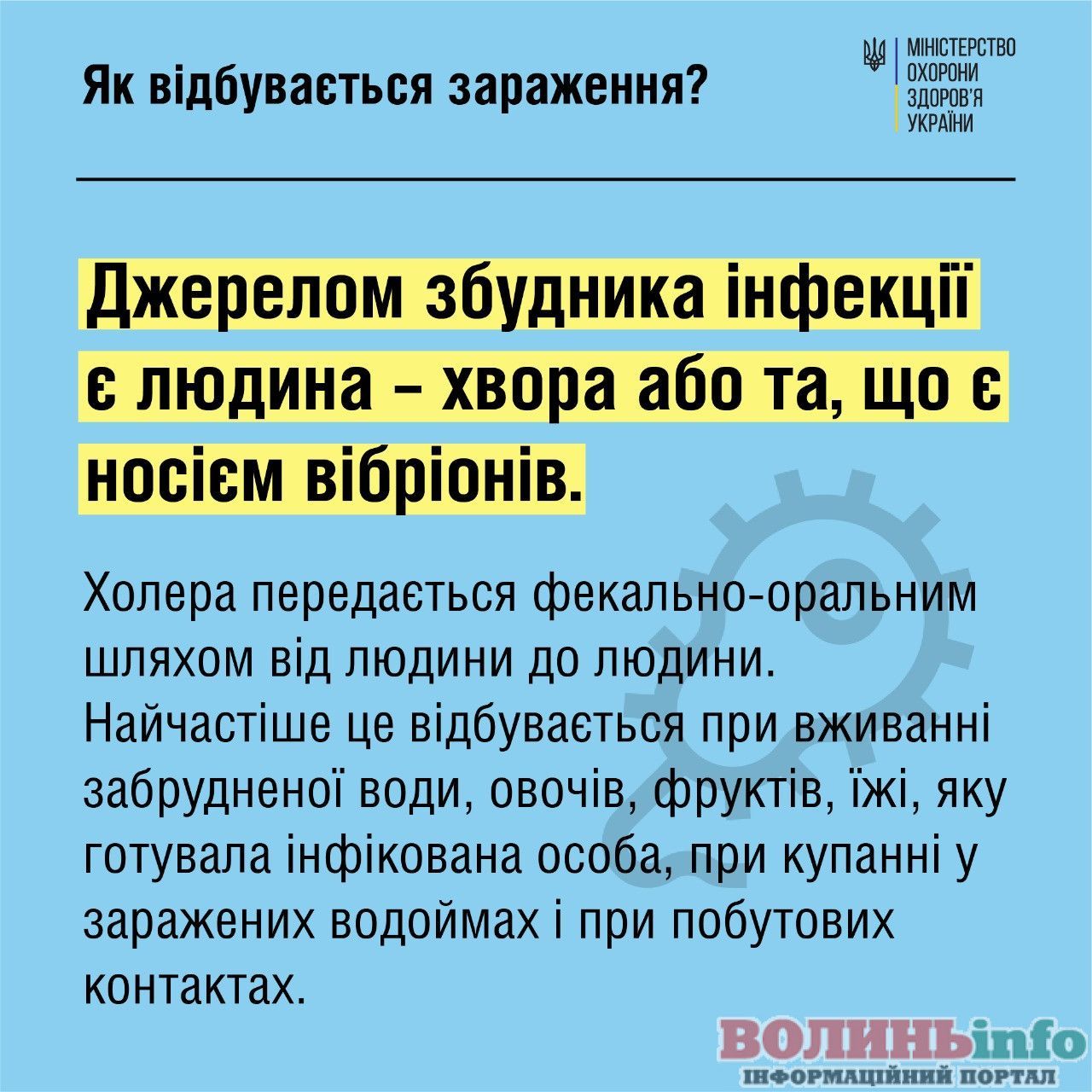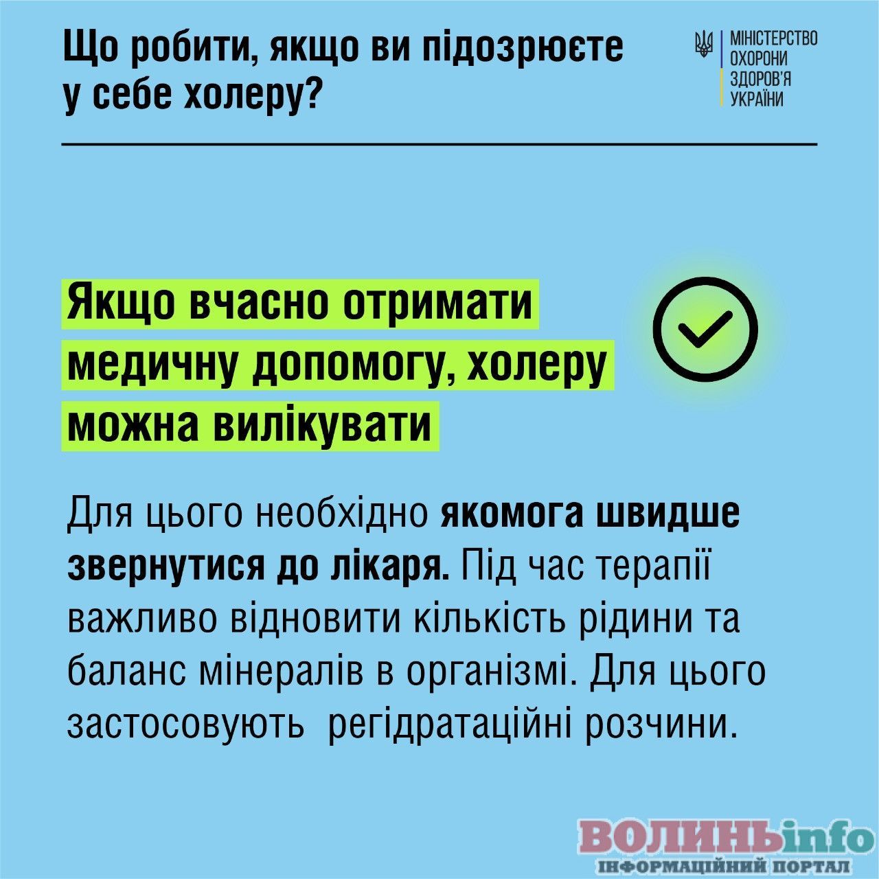 МОЗ надає інформацію (у вкладенні), які є прояви інфекційного захворювання та його наслідки, а також що потрібно знати, щоб вберегтися від зараження холерою.