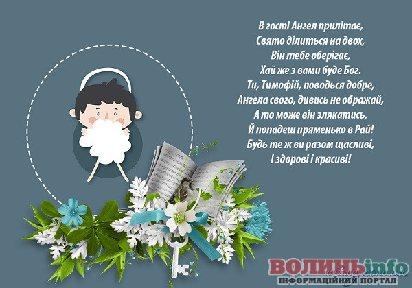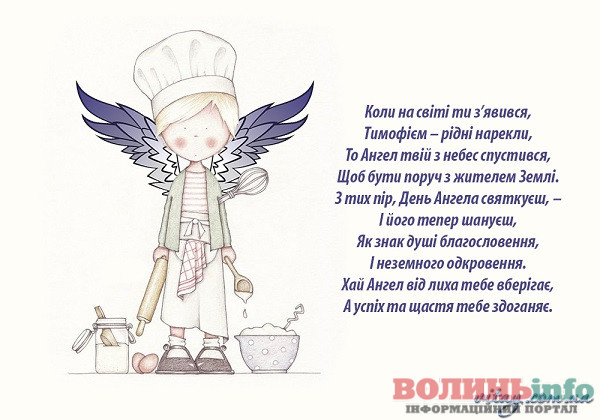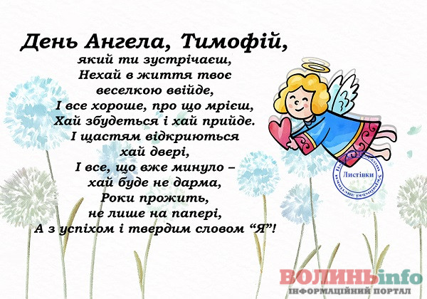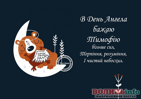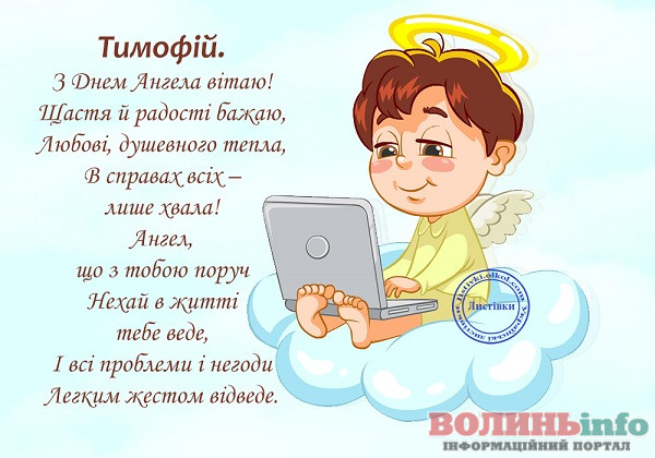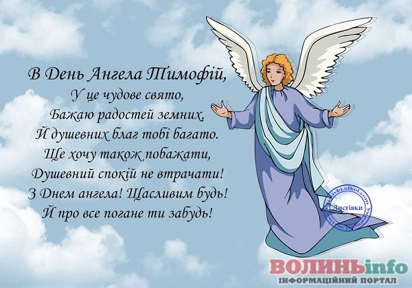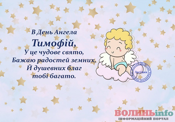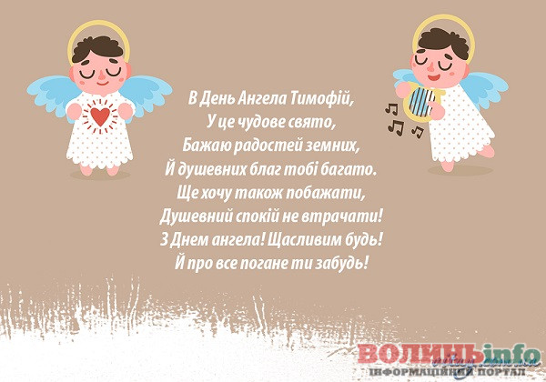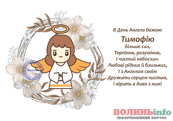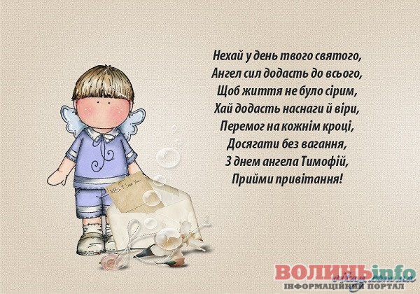 В цей святковий день вітаю Тимофія з Днем Ангела. Бажаю йому завжди відчувати підтримку свого ангела-хранителя, а також друзів та близьких. Нехай кожен день посміхається доброю звісткою, а ніч знімає всю втому і забирає неприємності.