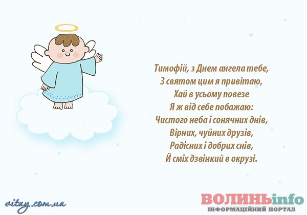 Дорогий Тимофій. Вітаю тебе з Днем Ангела і бажаю тобі завжди з посмішкою зустрічати новий день. Нехай всі бажання виконуються, а віра в краще супроводжує тебе по життю. Нехай твій ангел-охоронець завжди буде з тобою поруч і вберігає тебе від всього поганого.